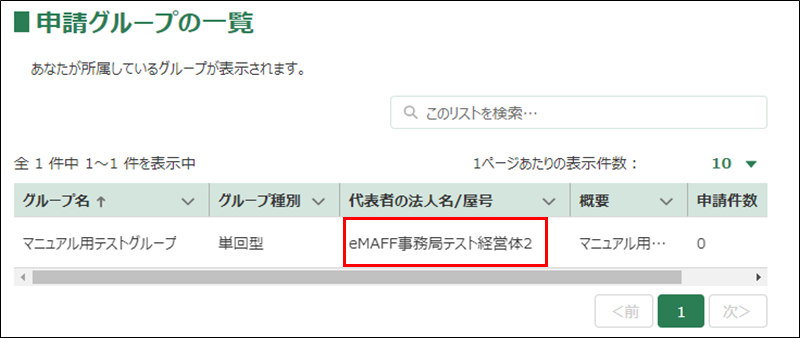 3.承諾した場合、「申請グループの一覧」画面の「代表者の法人名/屋号」が更新されます。