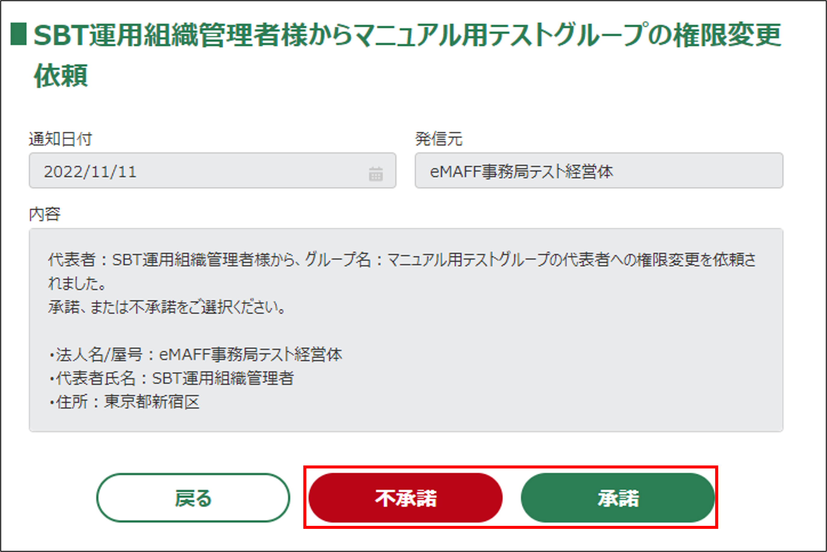 要請を受けた経営体が「承諾」すると、代表権限が譲渡されます。