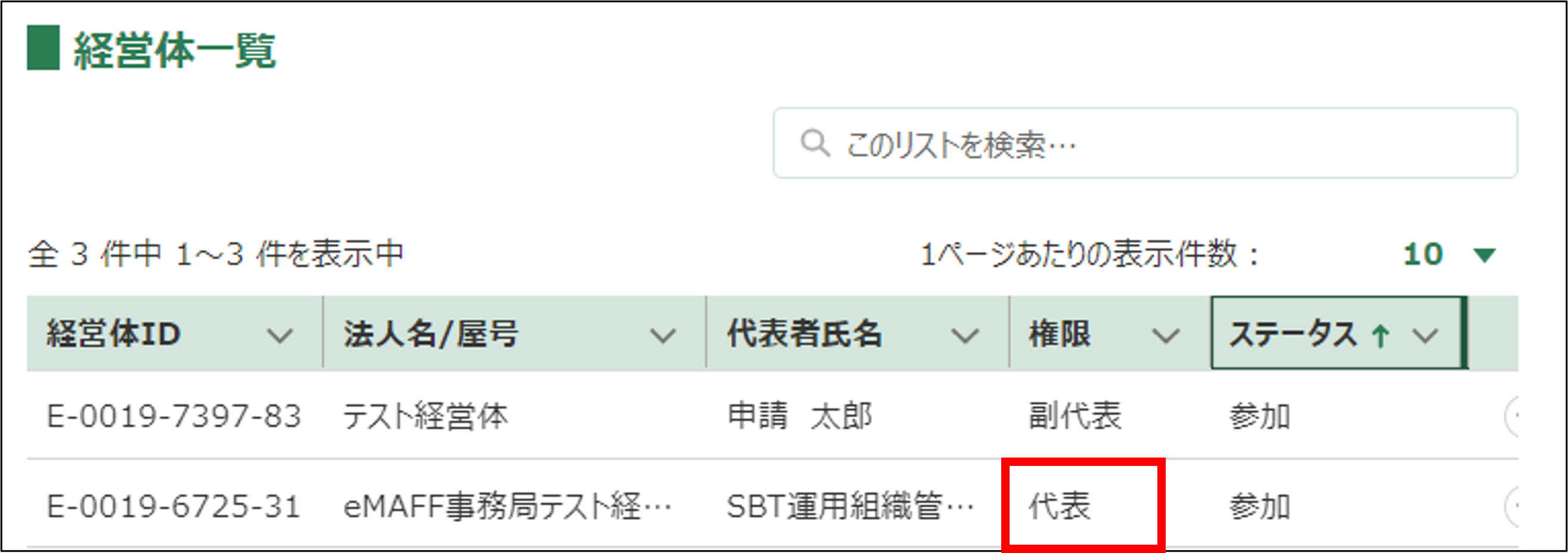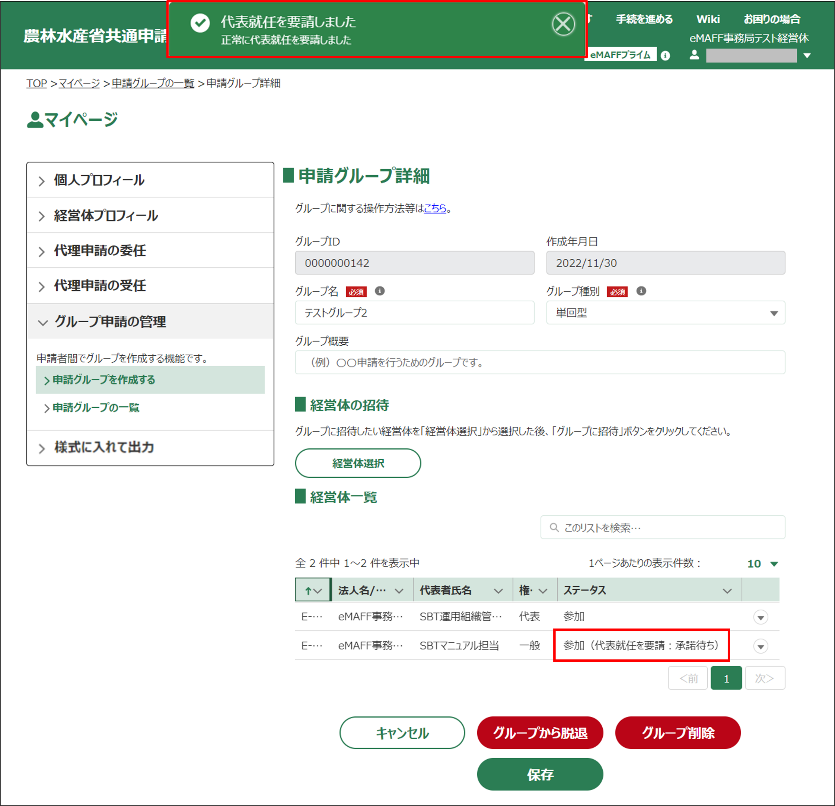 また、「申請グループ詳細」画面の「経営体一覧」に表示されている行の「権限」欄も「代表」に更新されます。