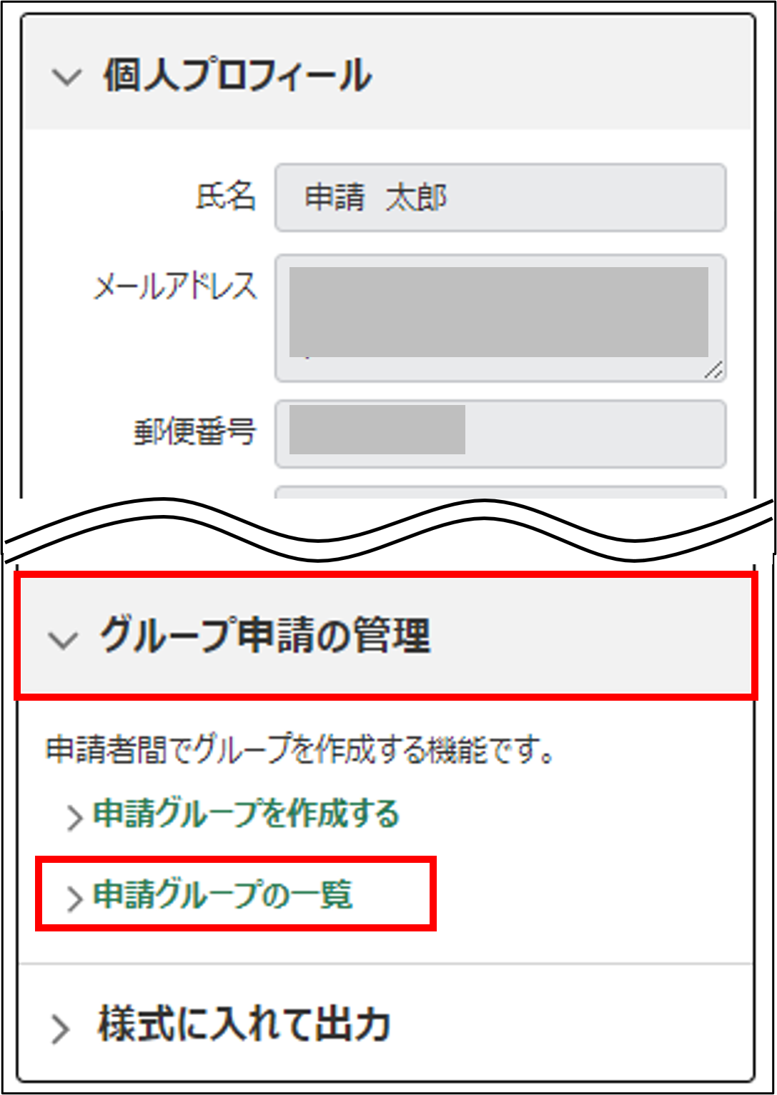 「申請グループの一覧」をクリックします。