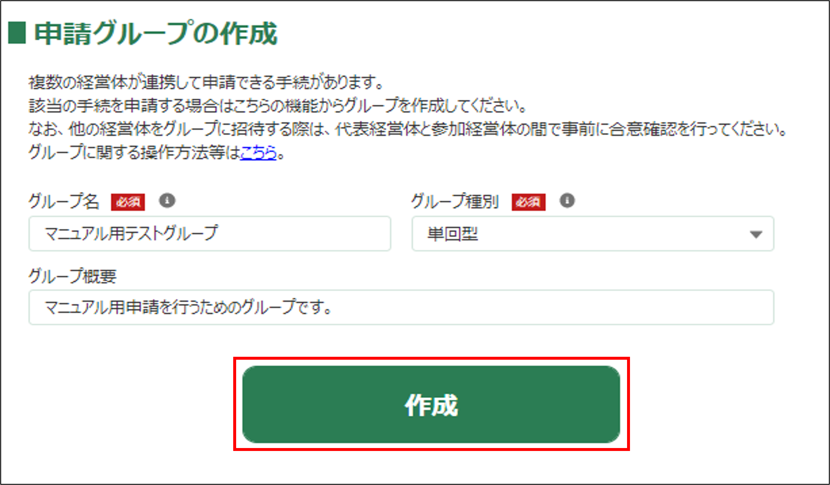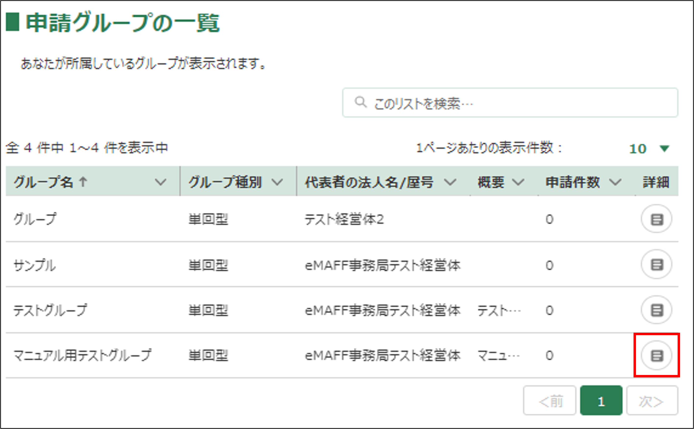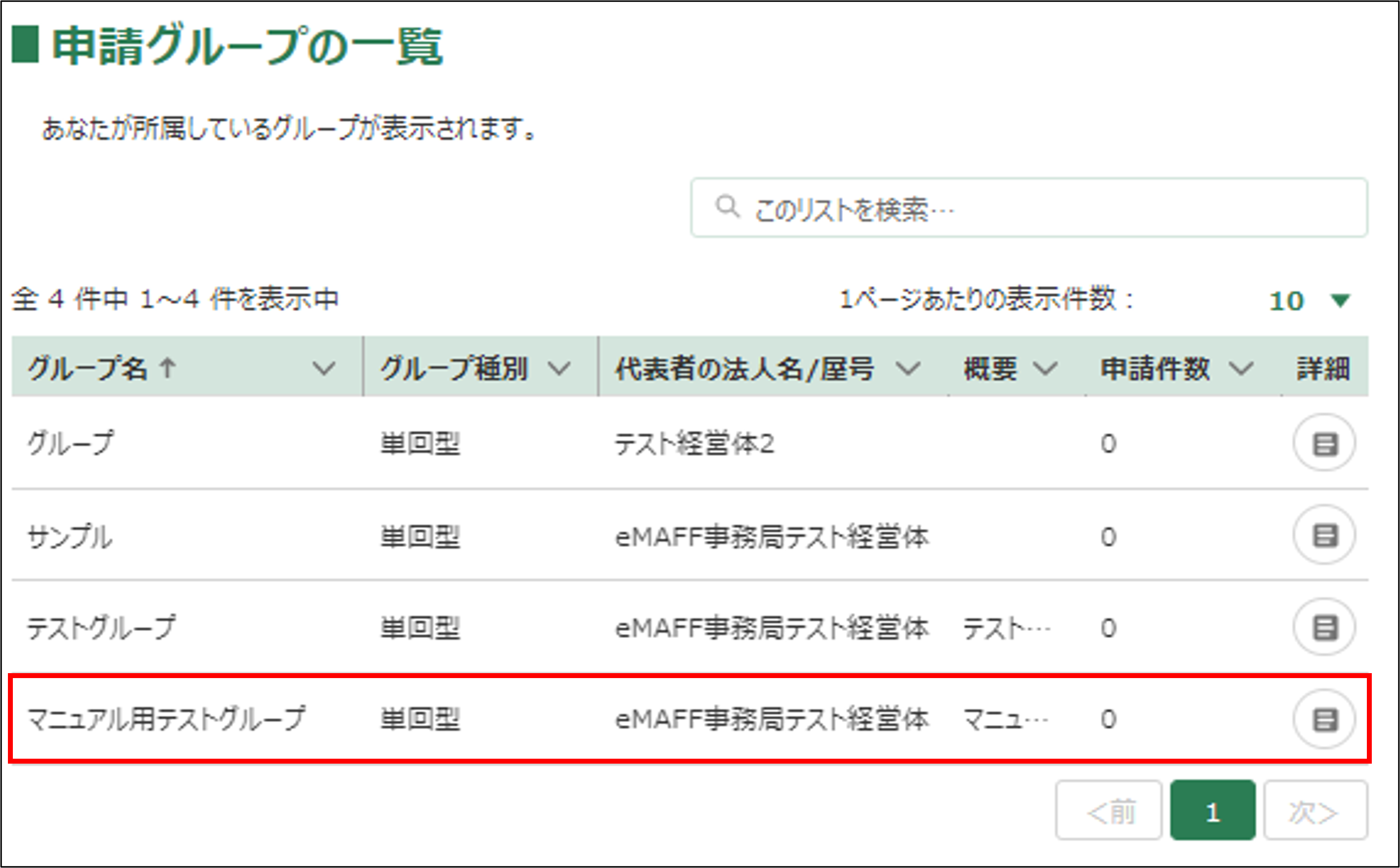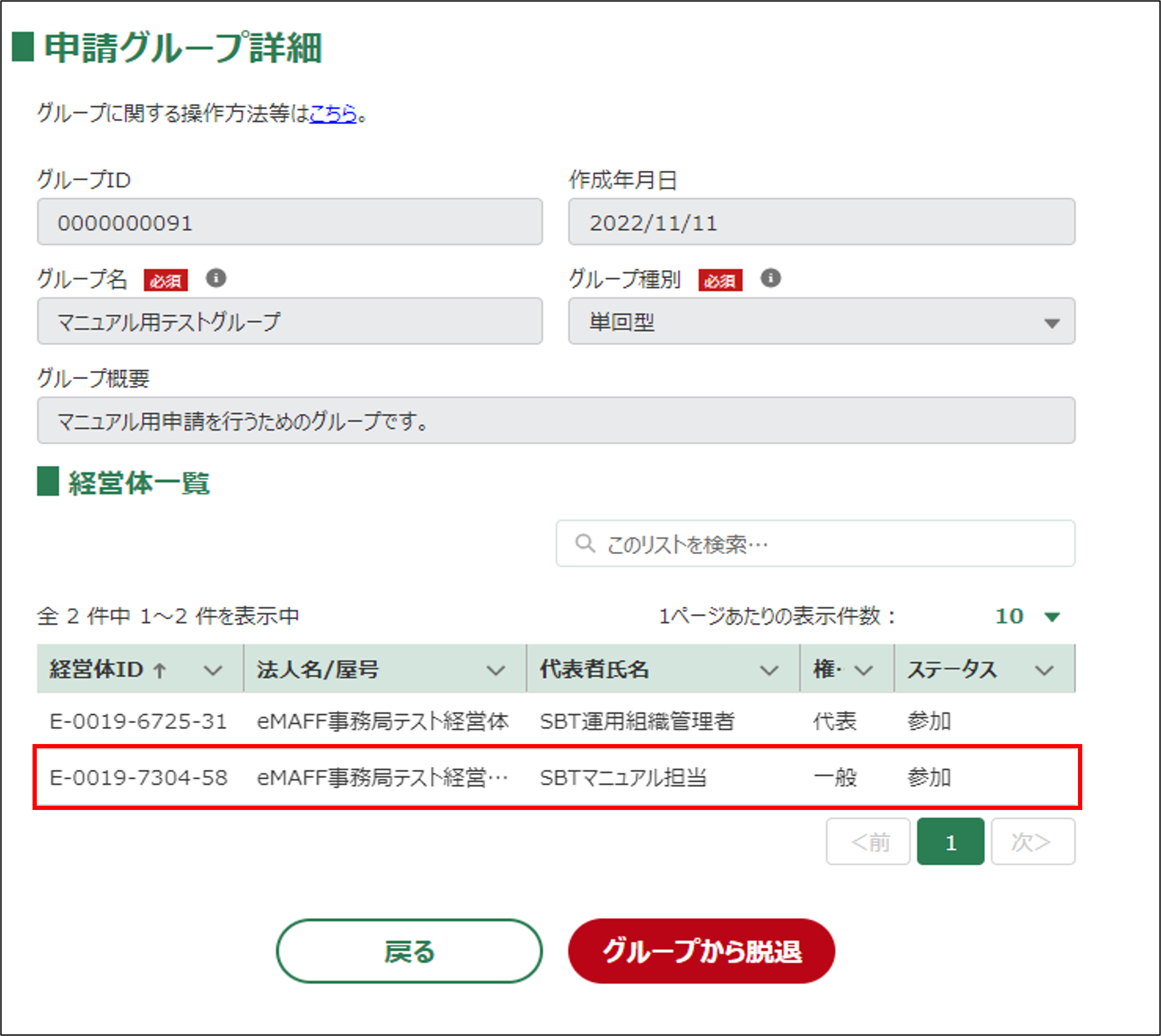6.「申請グループ詳細」画面の経営体一覧に、自身の経営体が追加されていることを確認します。