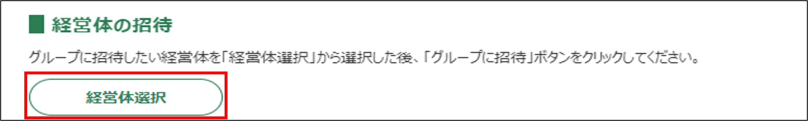 ※招待したい経営体が「グループ申請の機能」を有効にしている場合のみ表示されます。表示されない場合は、「グループ申請の機能」を有効にするよう連絡してください。詳細については、「経営体情報を確認・変更する」の(6)をご参照ください。
