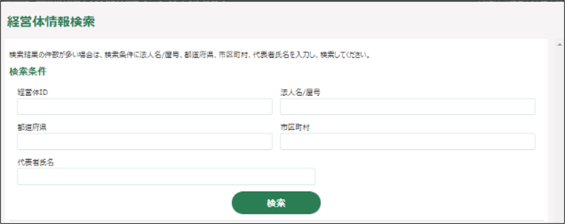 3.「経営体情報検索」画面が表示されます。検索条件に招待したい経営体の情報を入力し、「検索」ボタンをクリックします。
