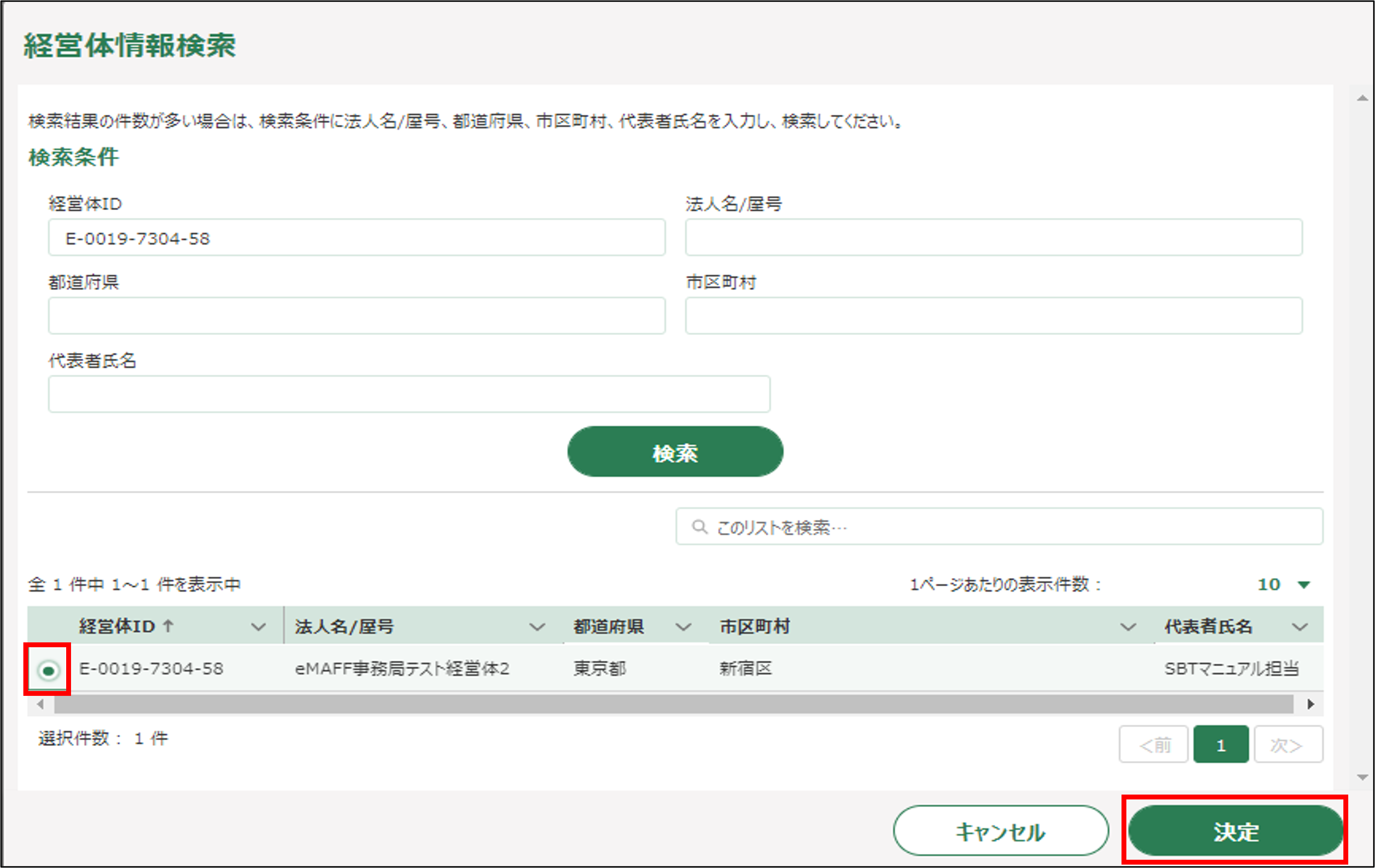 4.招待したい経営体が一覧に表示されます。画面左端の「○」をクリックして「決定」ボタンをクリックします。