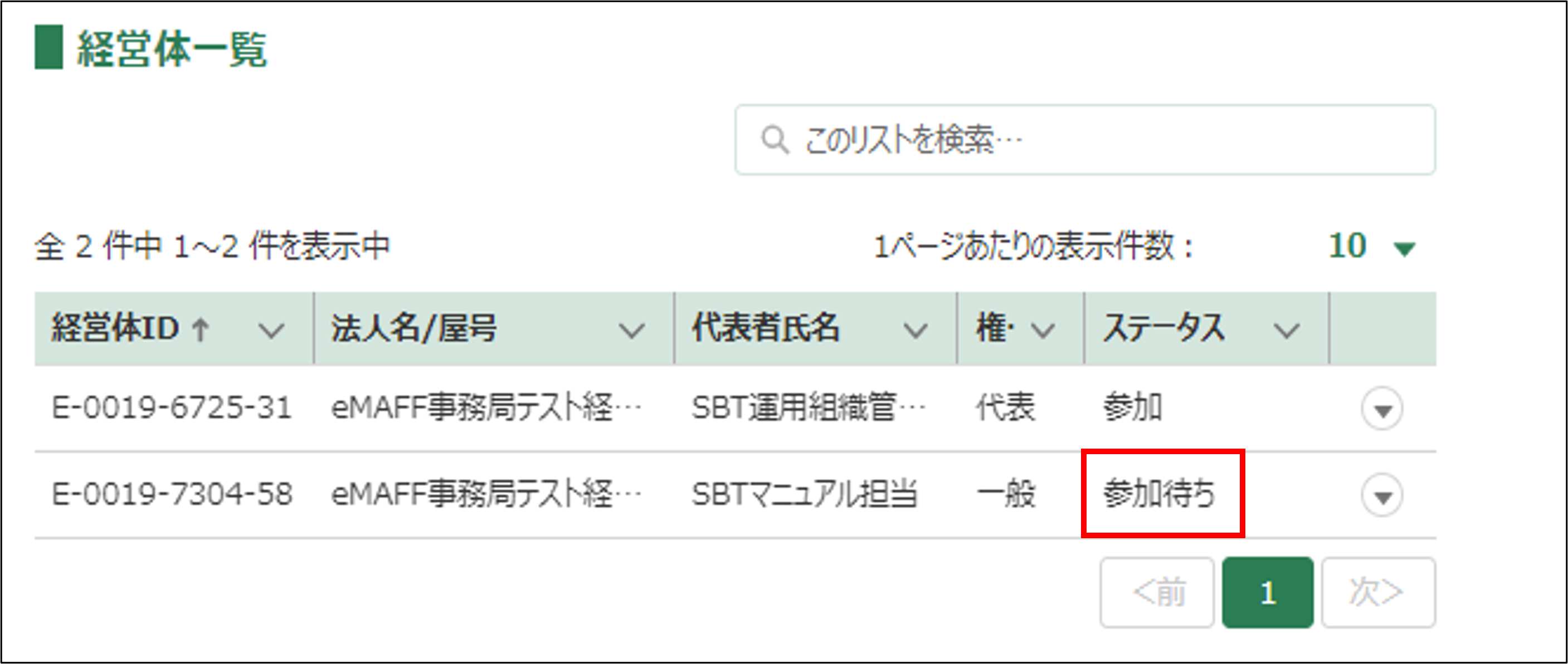 「経営体一覧」に、参加している経営体の情報が表示されます。