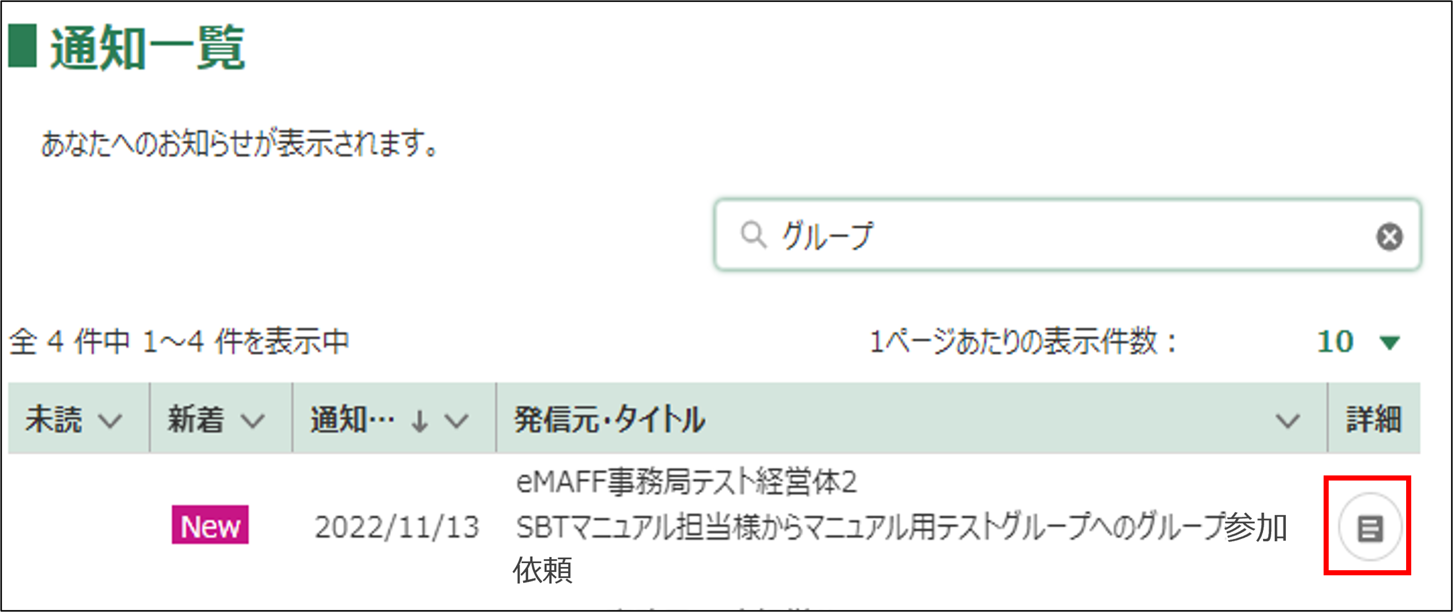 通知一覧から「グループ参加依頼」の「」ボタンをクリックします。
