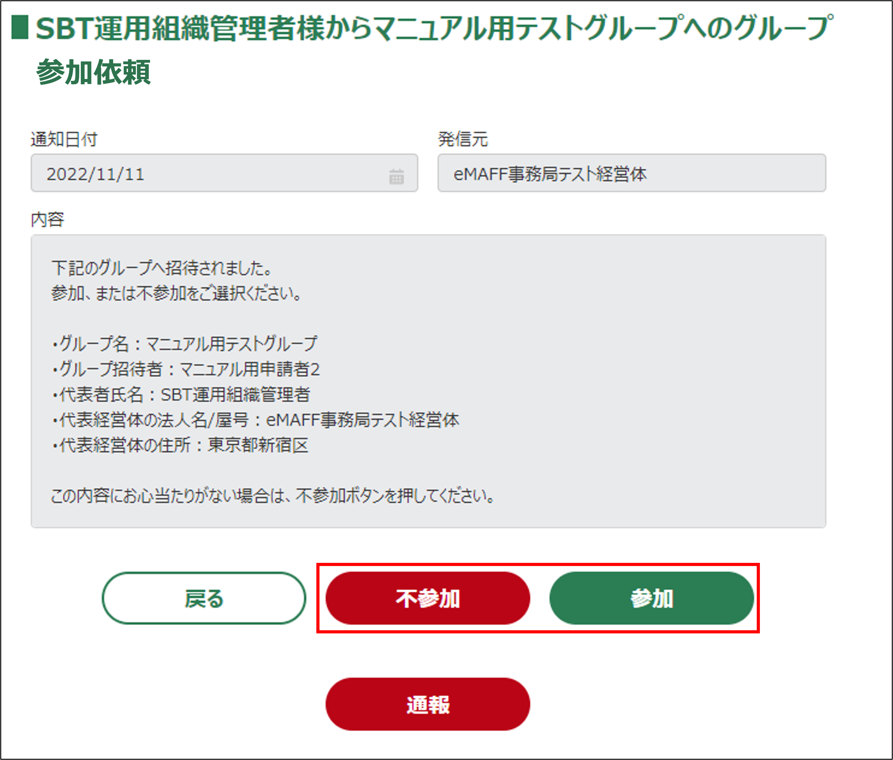 2.事前にグループ申請の合意確認を行った申請者からの依頼であることを確認し、「参加」ボタンをクリックします。