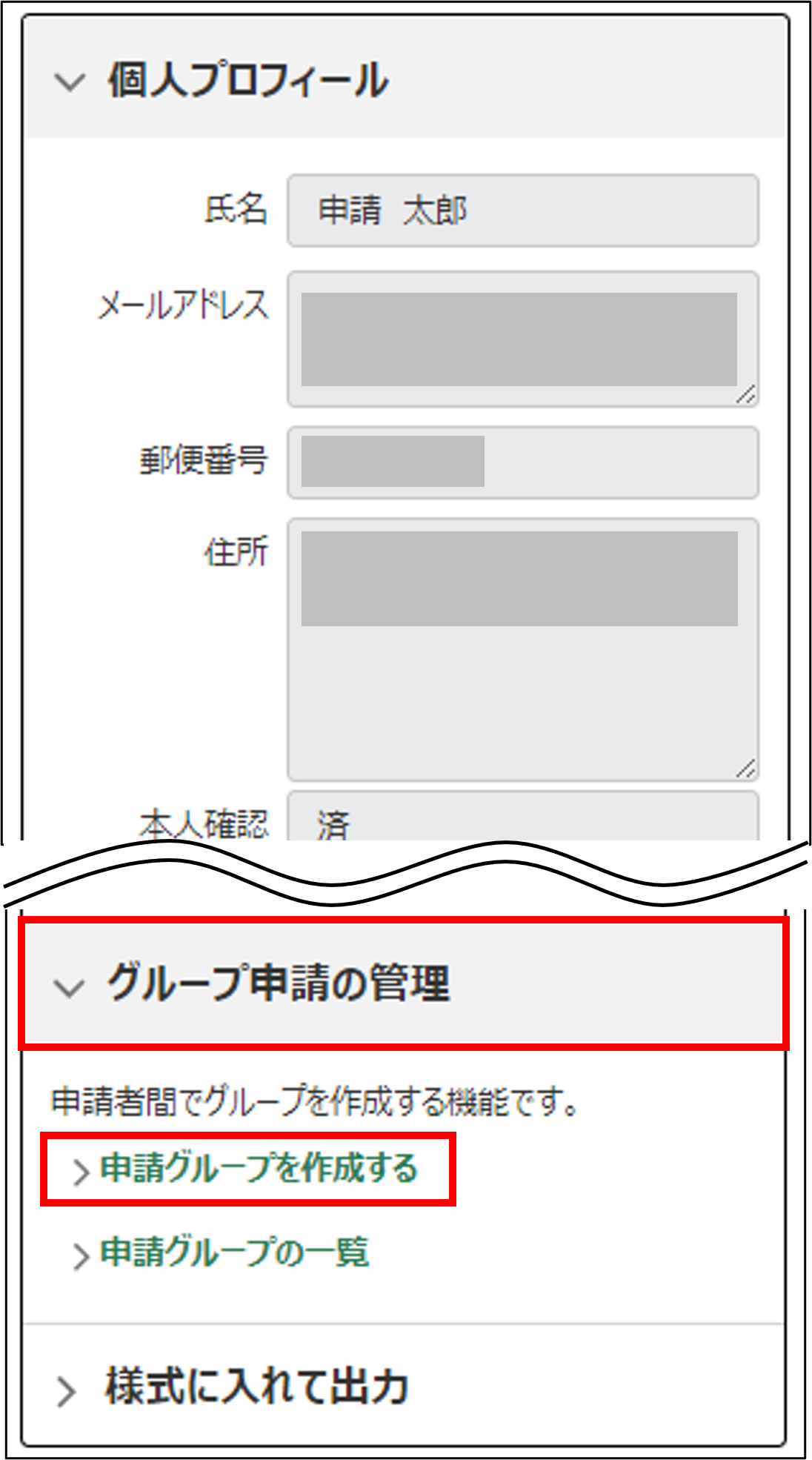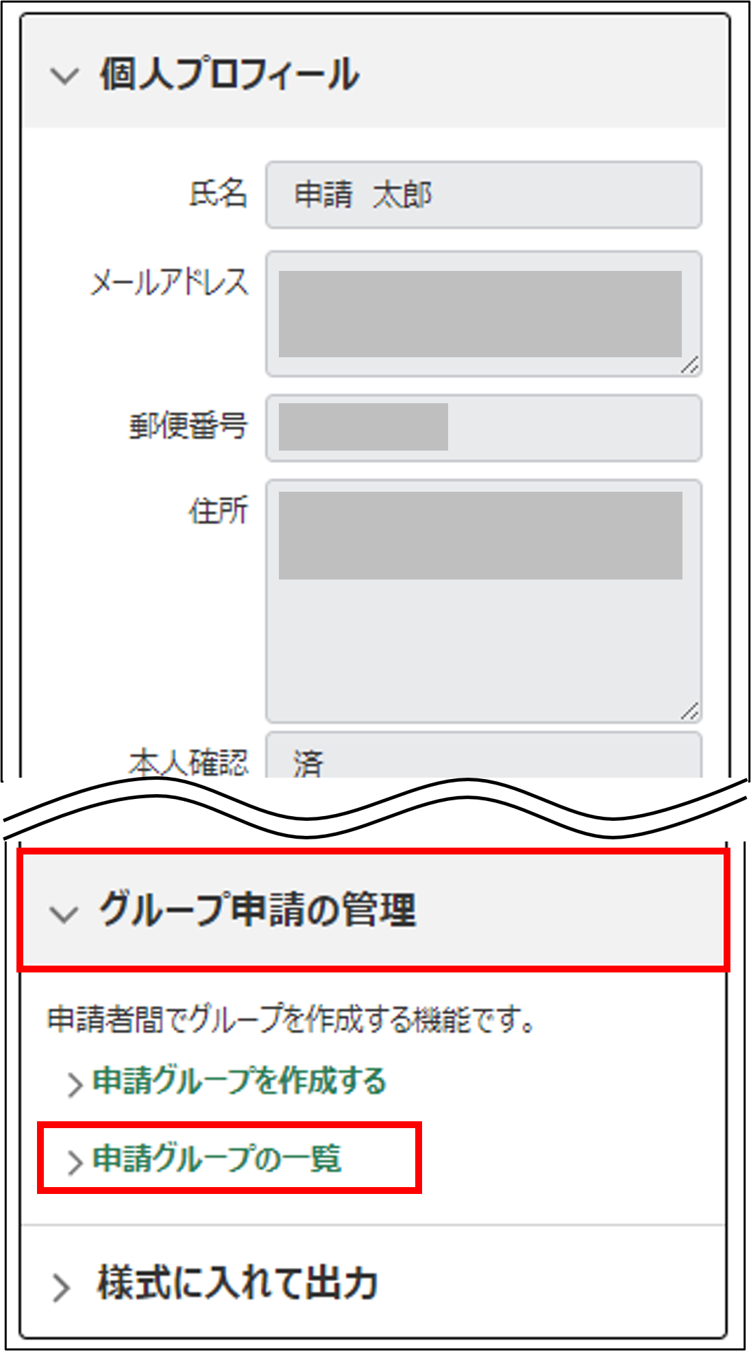 2.「マイページ」画面左側の「グループ申請の管理」をクリックします。