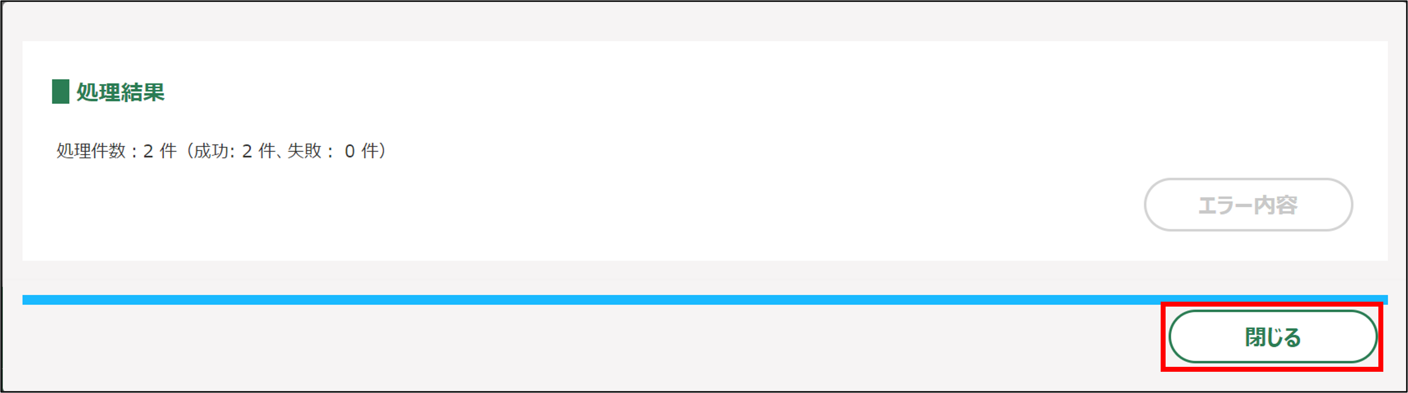 ※処理結果の「失敗件数」に数値がある場合は、「エラー内容」ボタンをクリックし、ダウンロードされたファイルをご確認ください。
