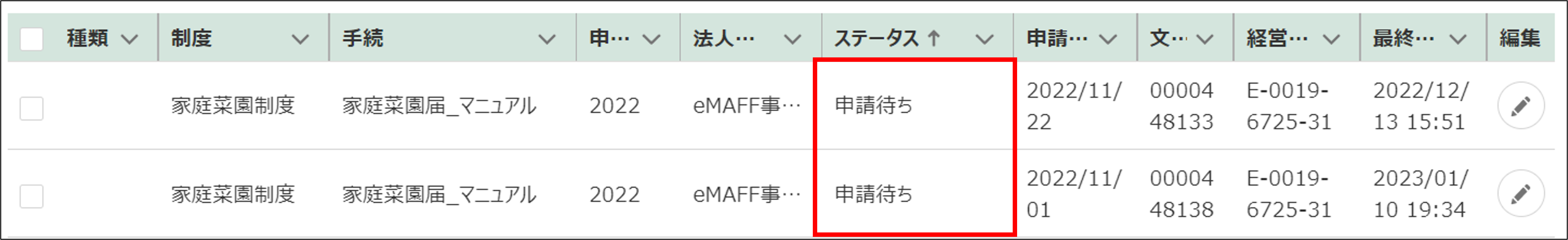 5.取り下げた申請の「ステータス」欄が「申請待ち」となります。