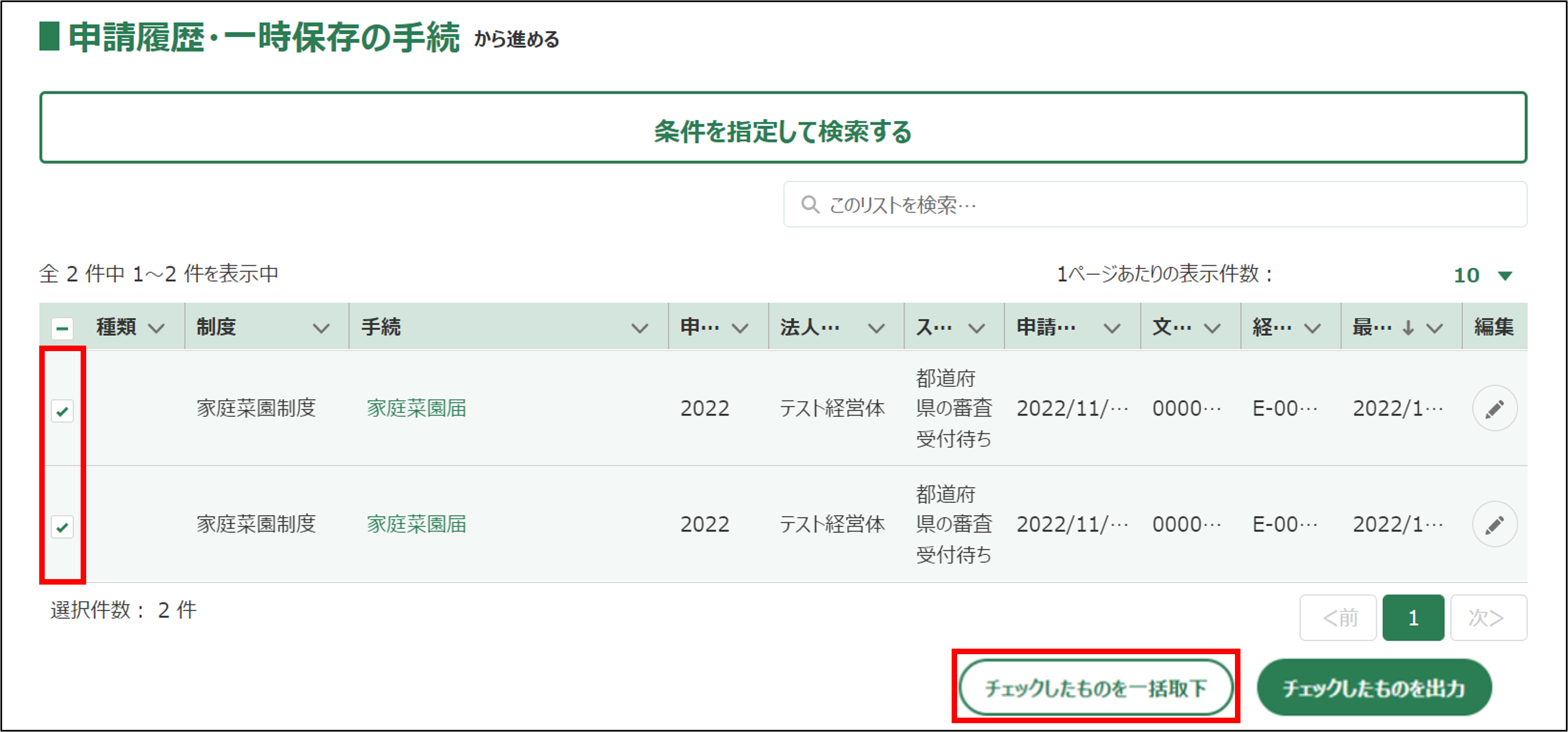 取り下げたい申請情報の左側の「□」にチェックし、「チェックしたものを一括取下」ボタンをクリックします。
