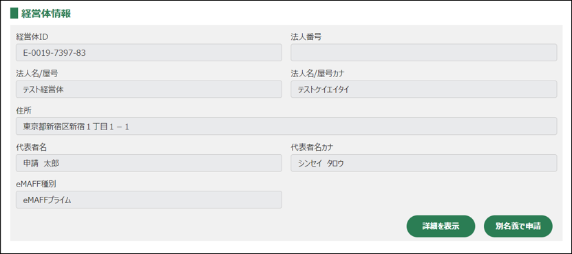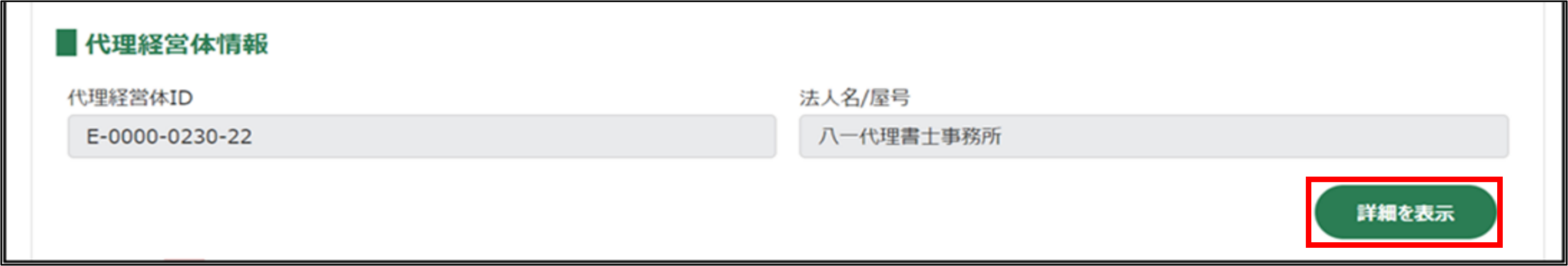 申請代行の場合は、「代理経営体情報」欄が表示されます。「詳細を表示」ボタンをクリックすると、申請代行を実施する方の経営体プロフィールが別タブで表示されます。