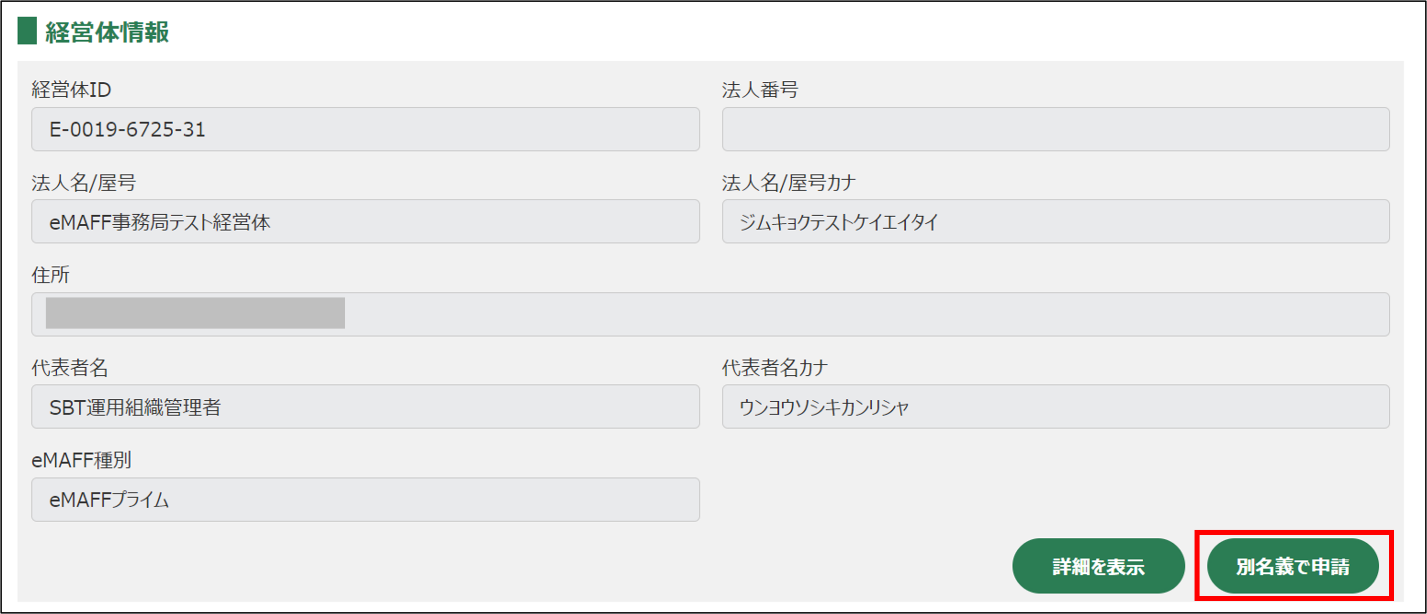 6.「手続の詳細」画面に自動で戻ります。「経営体情報」欄に選択した経営体が表示されていることを確認します。