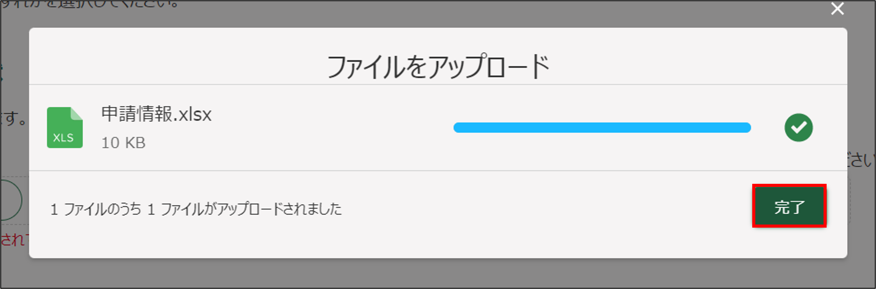 「XファイルのうちXファイルがアップロードされました」という画面が表示されます。「完了」ボタンをクリックします。