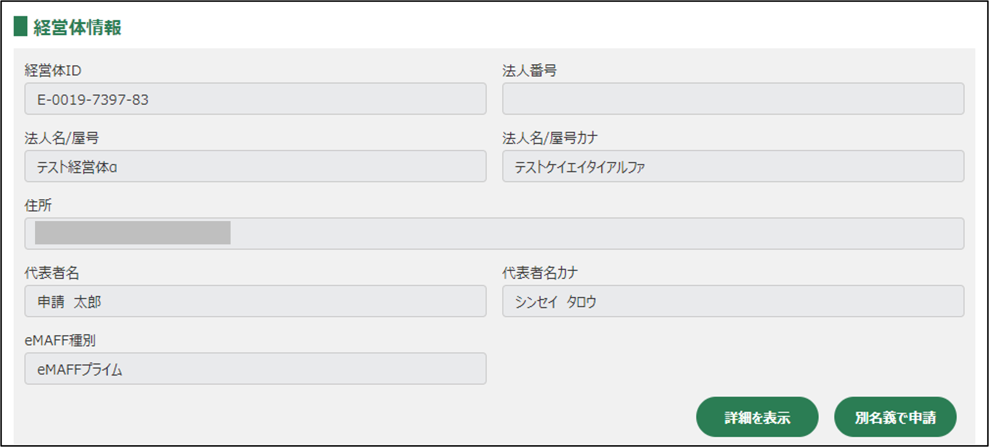| 法人名/屋号 | 法人名/屋号が表示されます。 |