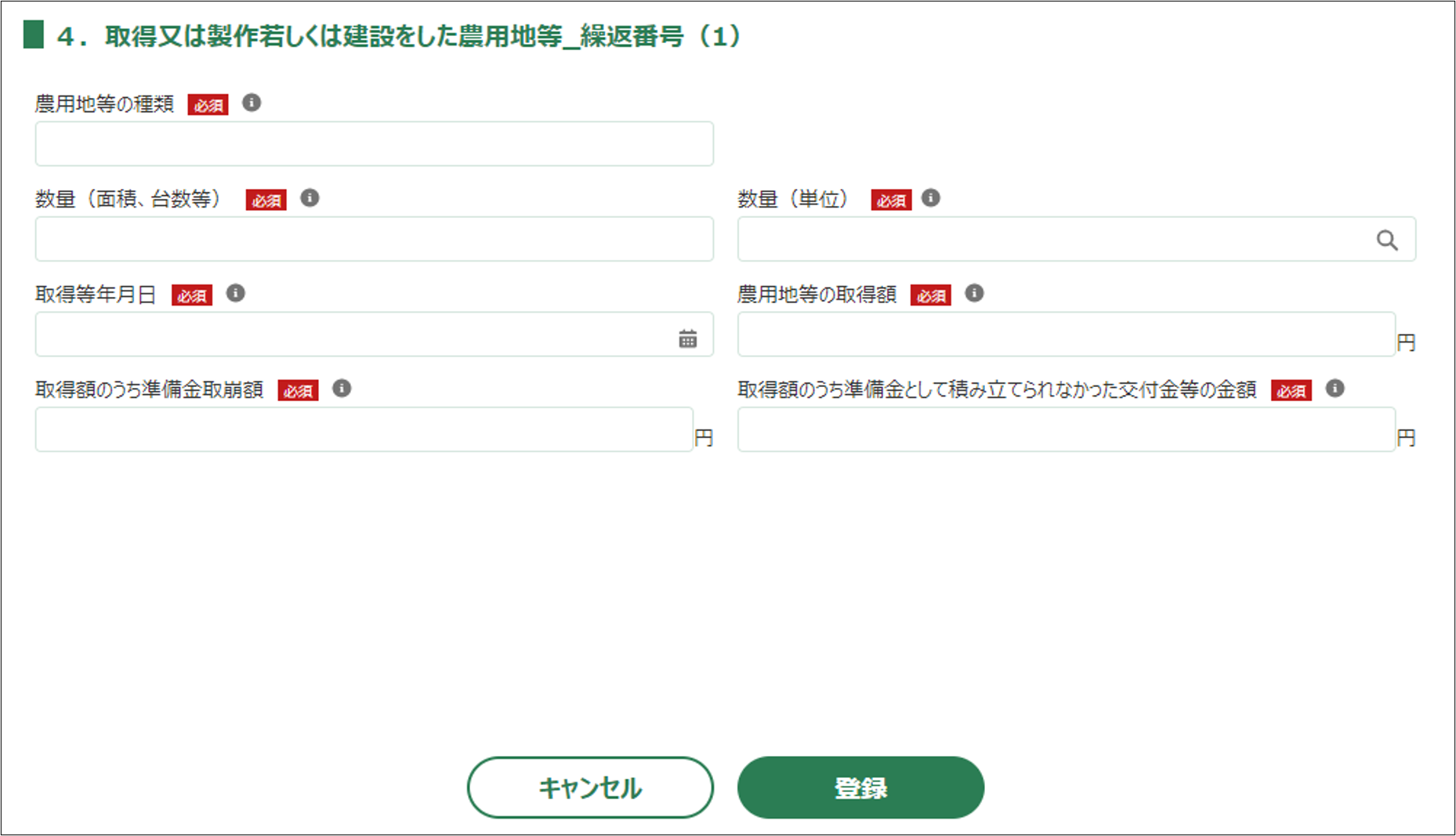 取得又は製作若しくは建設をした農用地等の入力画面が開きます。