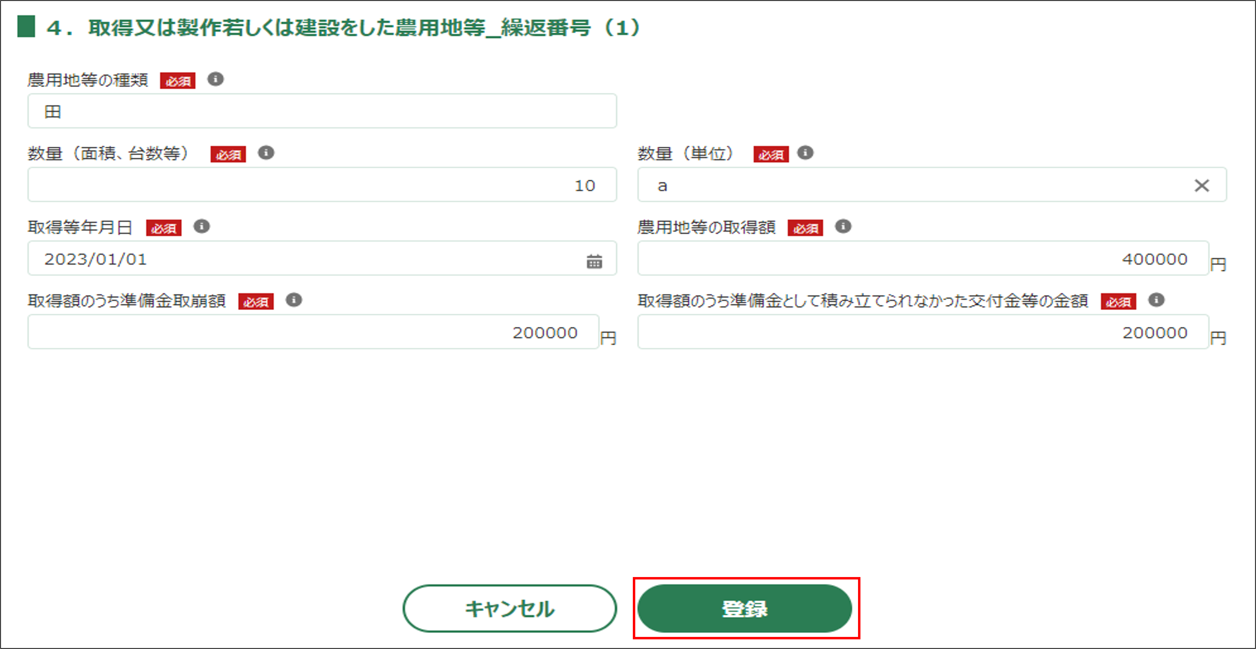 「取得又は製作若しくは建設をした農用地等」の情報が登録されます。