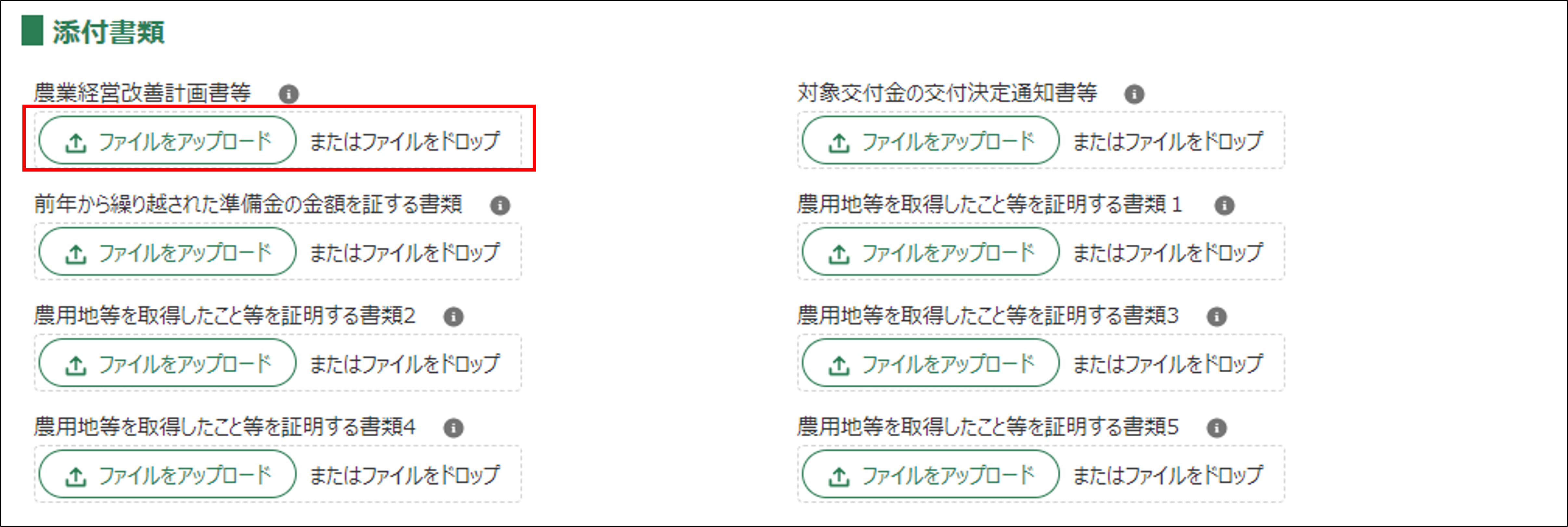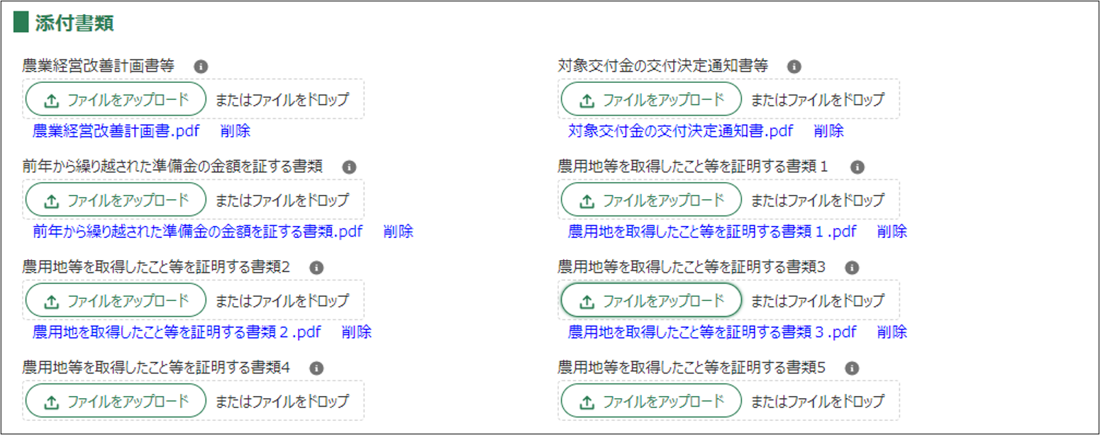 | 農用地等の種類 | 準備金制度を活用して取得した農用地等の種類を入力してください。様式第5号の「1.農用地等の取得計画」に記載されている必要があります。 |