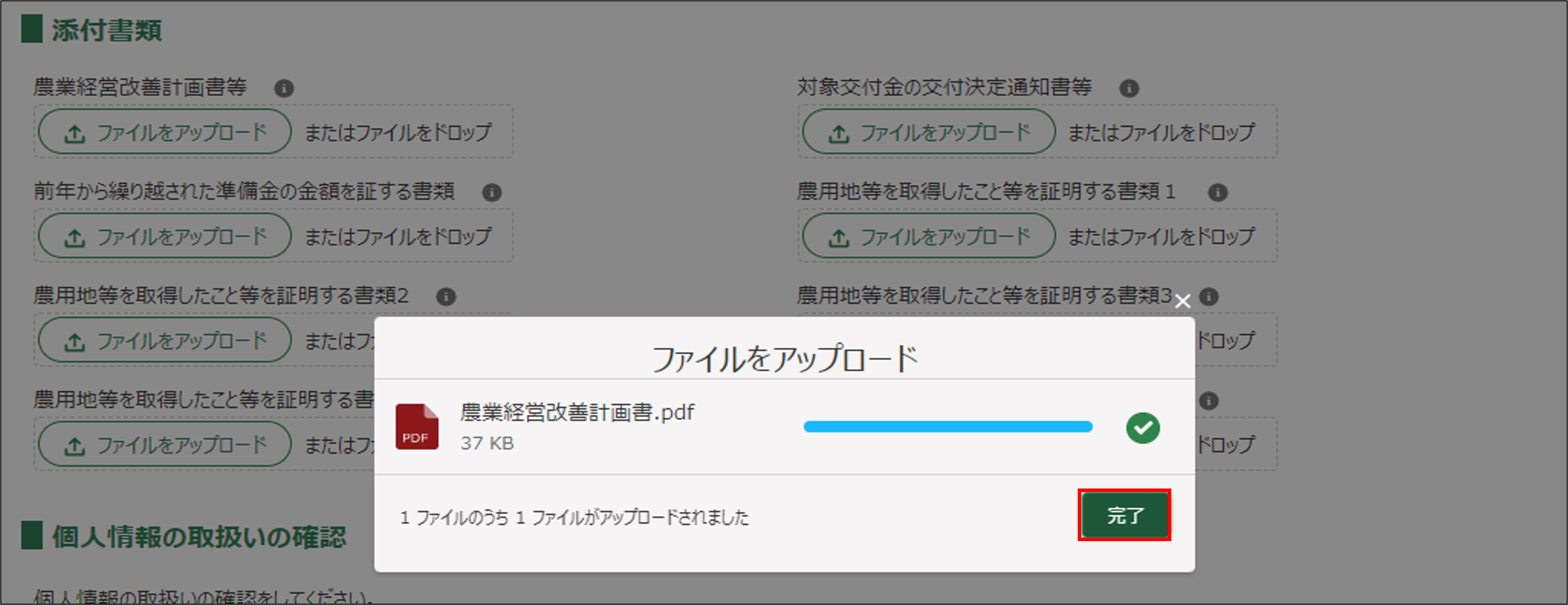 20.個人情報の取扱いの確認を行います。青字の個人情報の取扱いをクリックし、「個人情報の取扱い(eMAFF用)様式6号関係」を確認します。