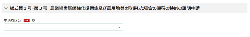 1.「様式第1号・第3号 農業経営基盤強化準備金及び農用地等を取得した場合の課税の特例の証明申請」を入力します。