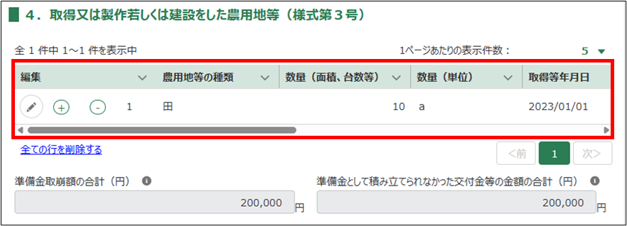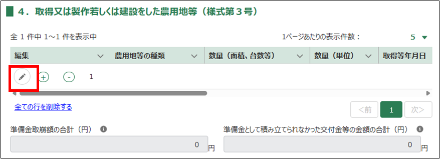 5.「4.取得又は製作若しくは建設をした農用地等(様式第3号)」を入力します。「」ボタンをクリックします。