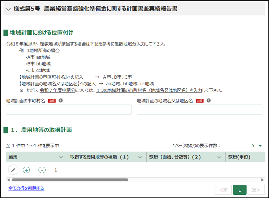 | 地域計画の市町村名 | 農業を担う者に位置付けられている地域計画がある市町村名を入力して下さい。 また、令和8年度以降、取得しようとする農用地が複数の市町村の地域計画に位置付けられている場合、全ての市町村名を入力して下さい。 |