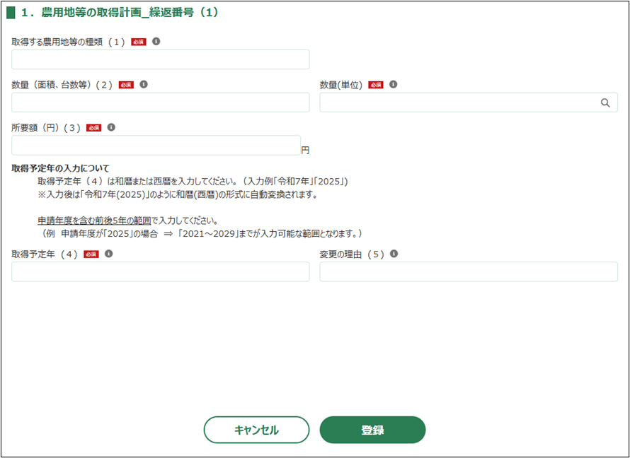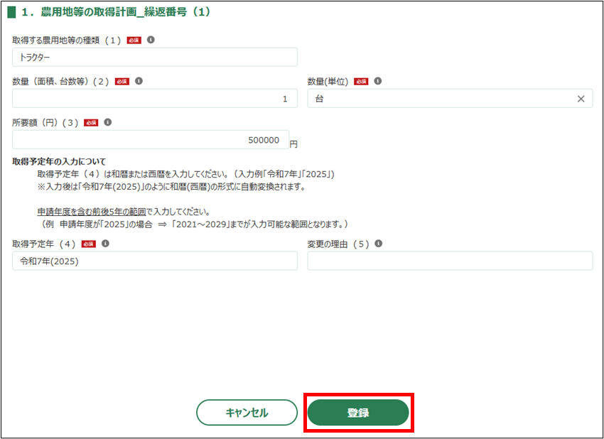 取得予定年を和暦または西暦で入力してください(入力例「令和7年」「2025」)。農業経営改善計画等の認定の有効期間内となります。 |