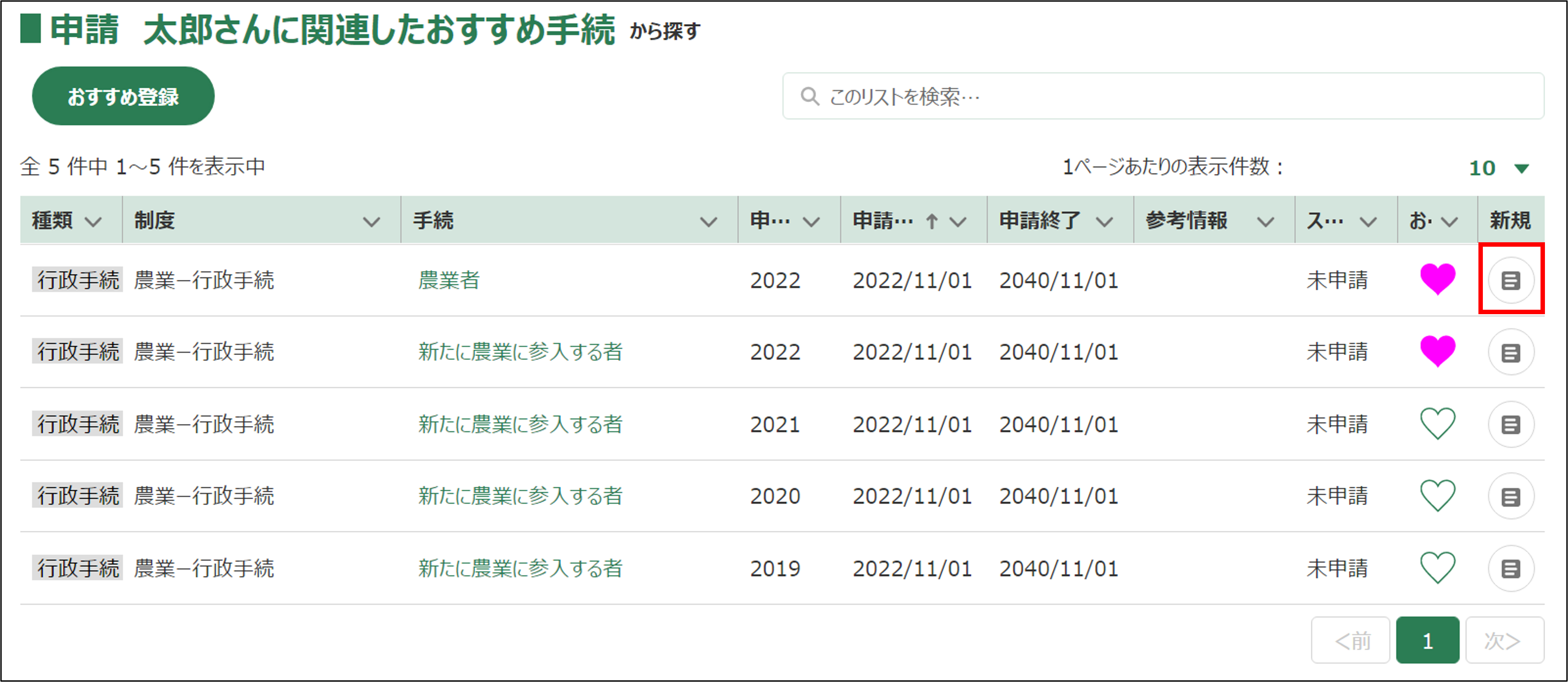 一覧に表示されている手続から、申請したい手続の「」ボタンをクリックします。