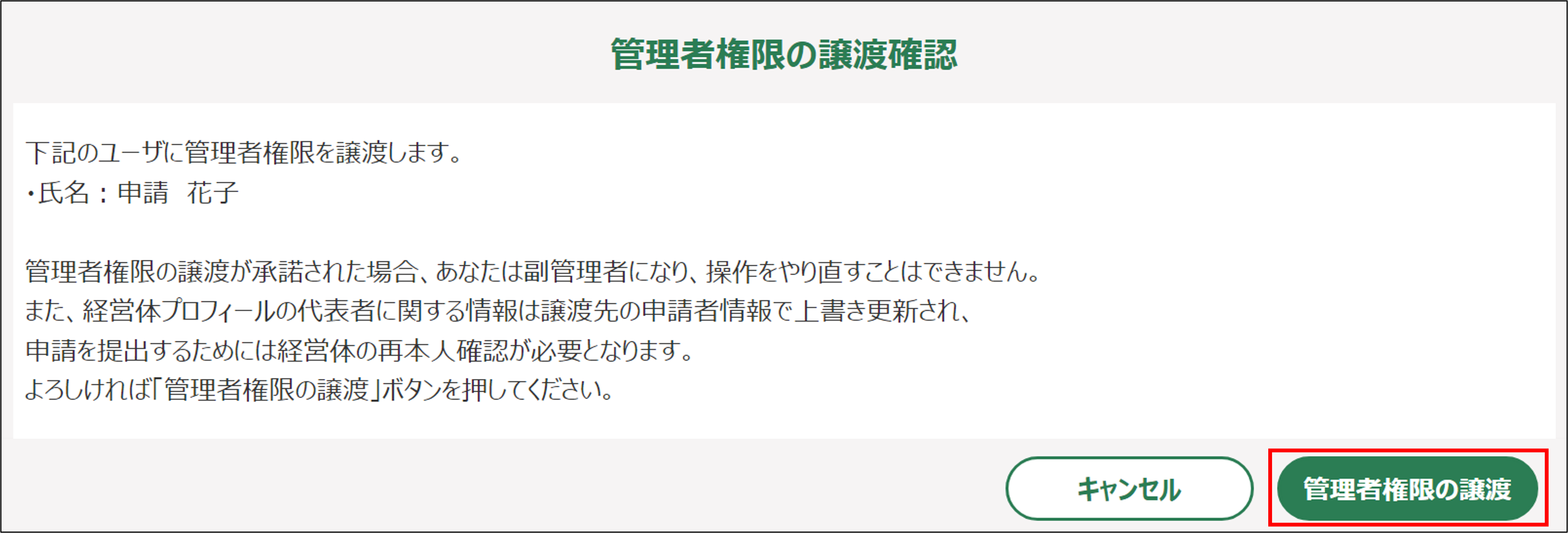 6.「管理者権限の譲渡確認」を確認後、「管理者権限の譲渡」ボタンをクリックします。