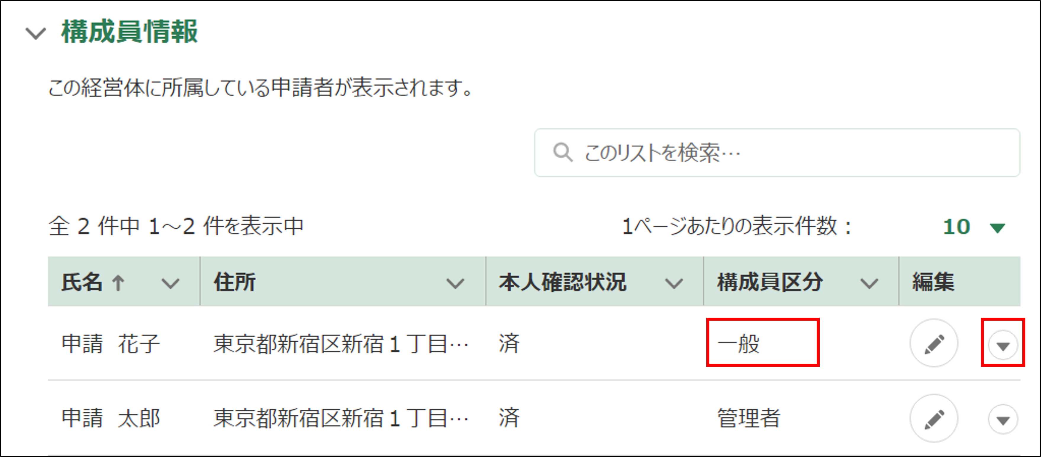 4.構成員情報の一覧が表示されます。構成員区分が「副管理者」又は「一般」の「▼」ボタンをクリックします。