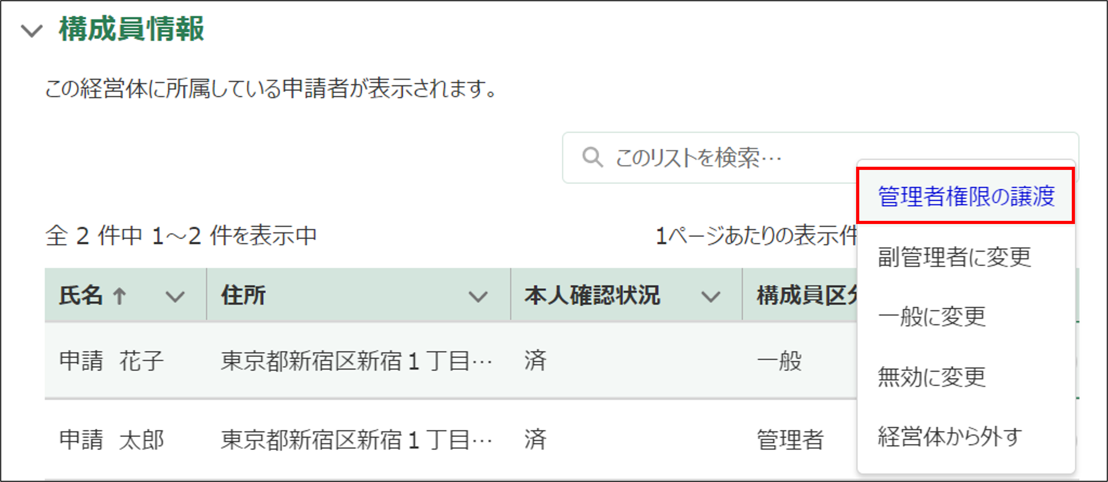 経営体の管理者は、構成員に対して管理者権限を譲渡できます。