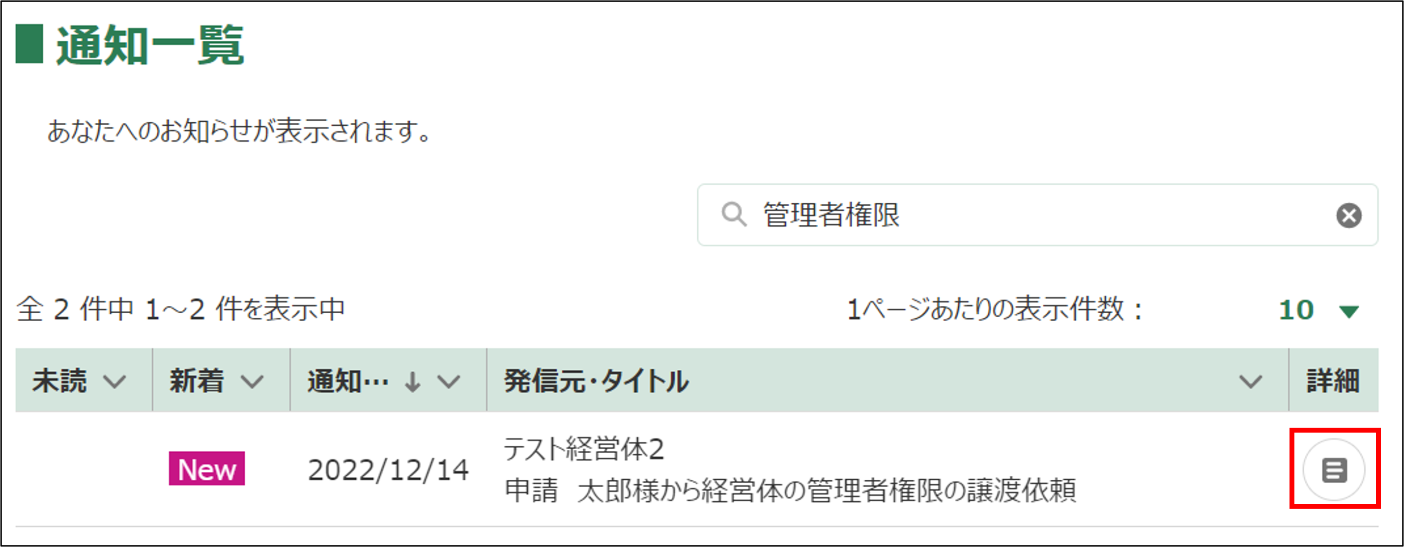 1.通知一覧から「経営体の管理者権限の譲渡依頼」の「」ボタンをクリックします。