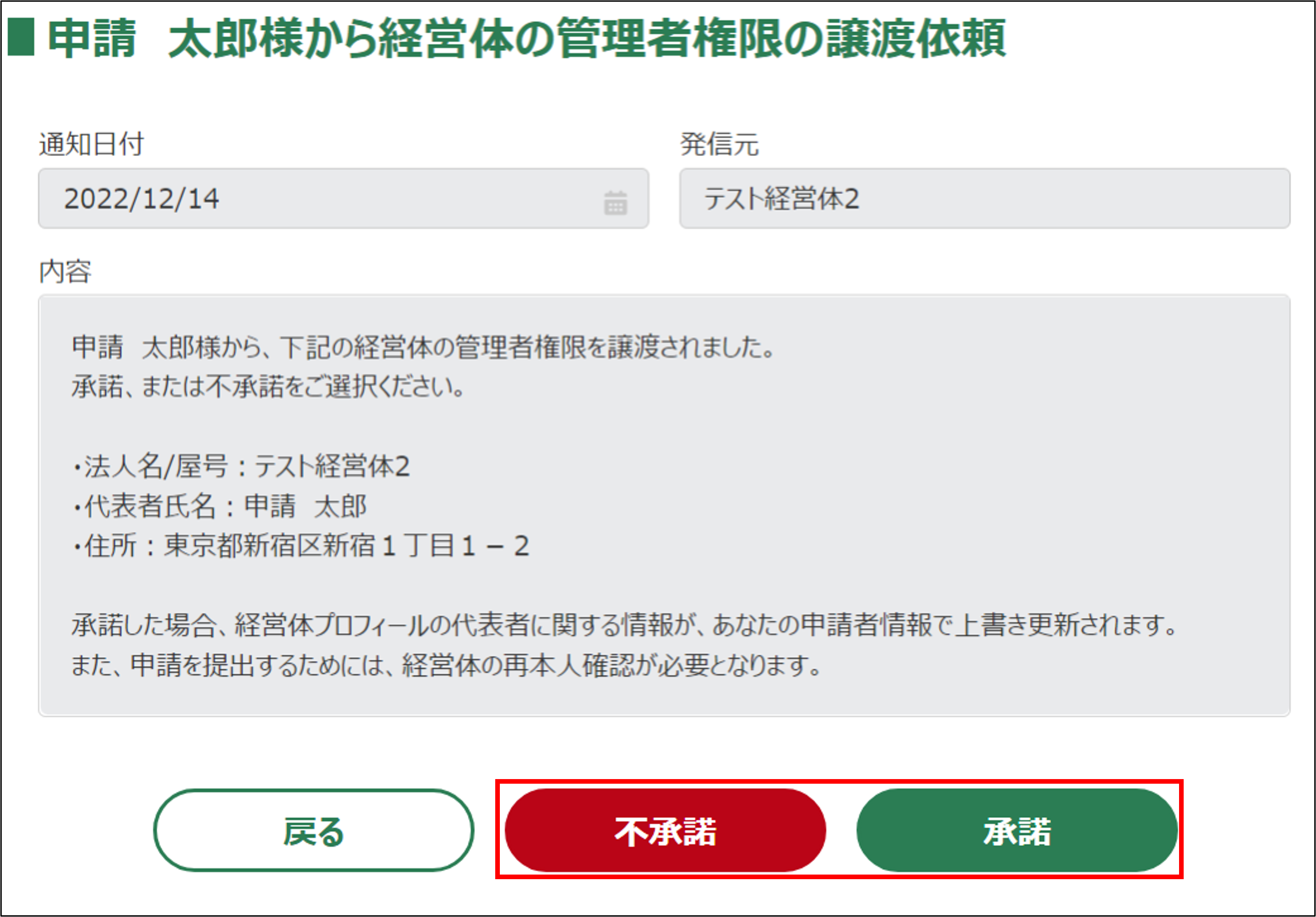 (2)「経営体の管理者権限の譲渡依頼」に返答する