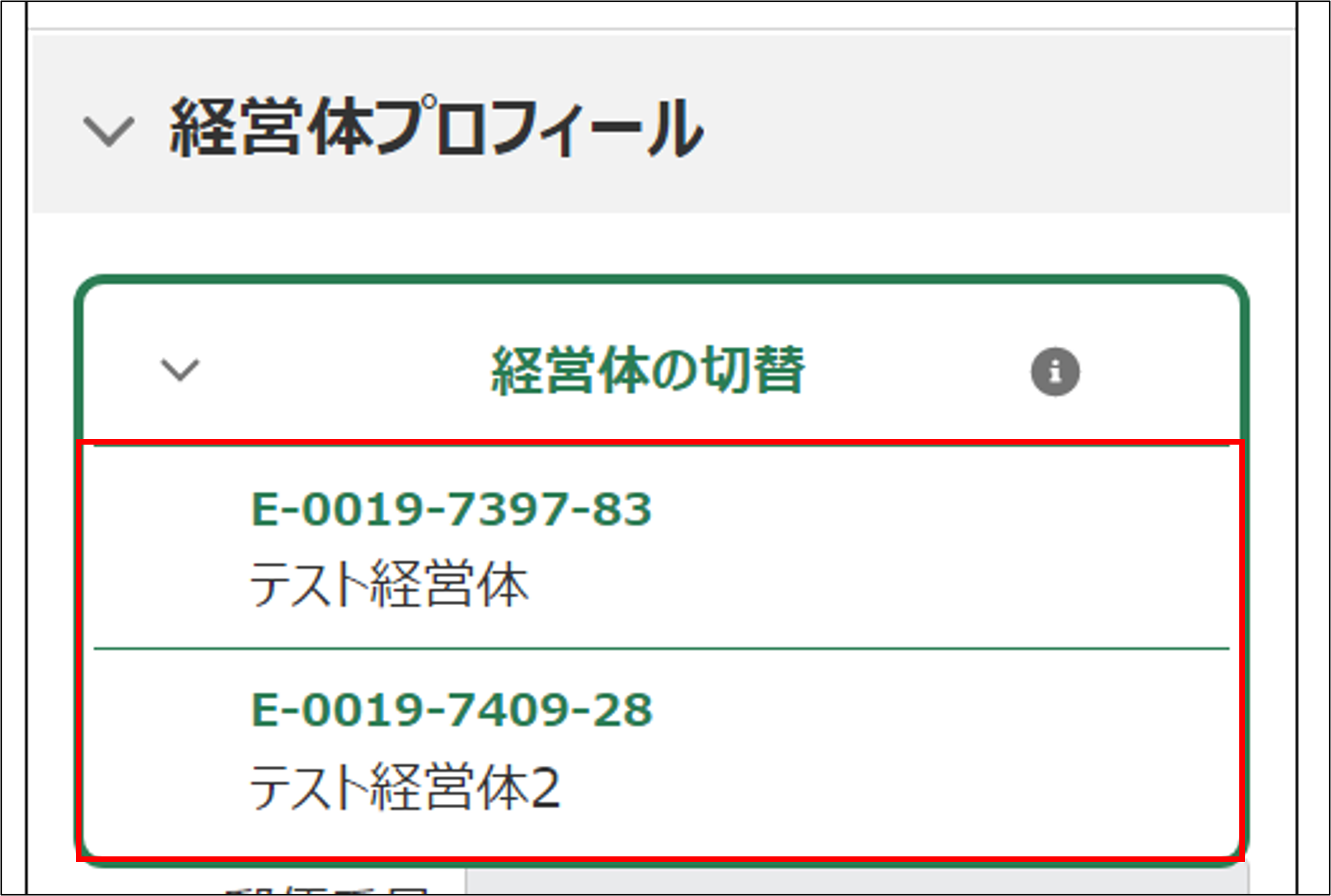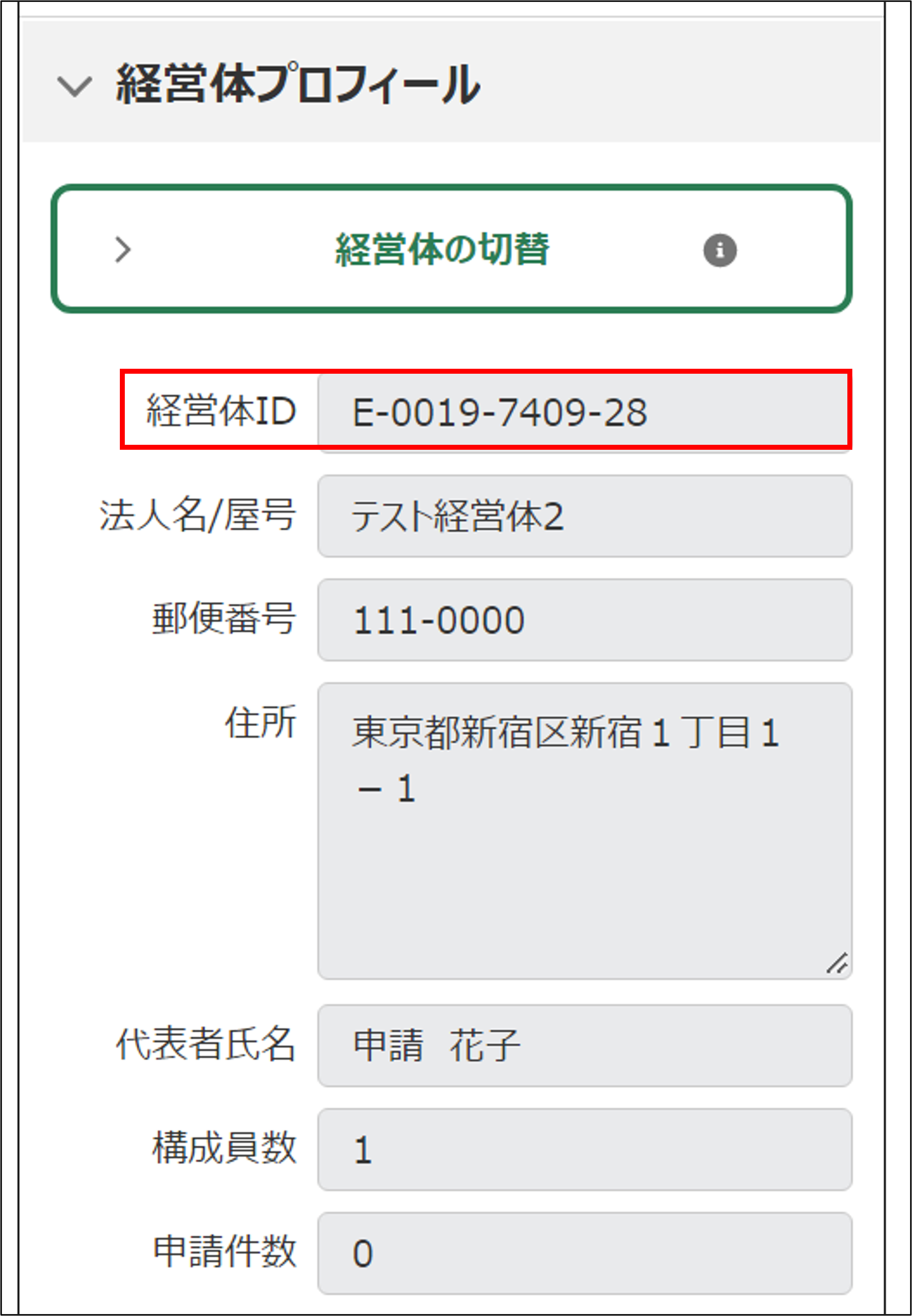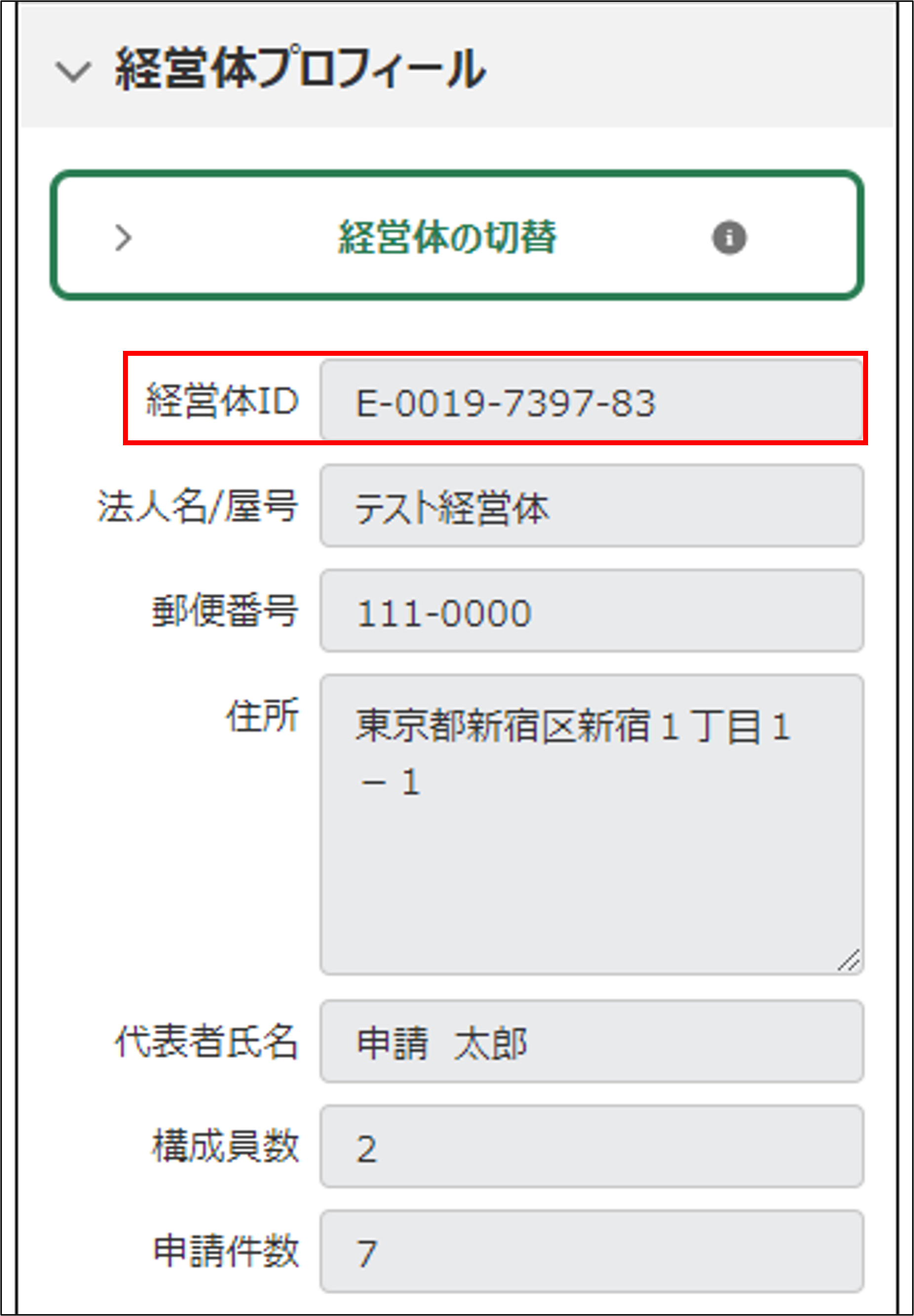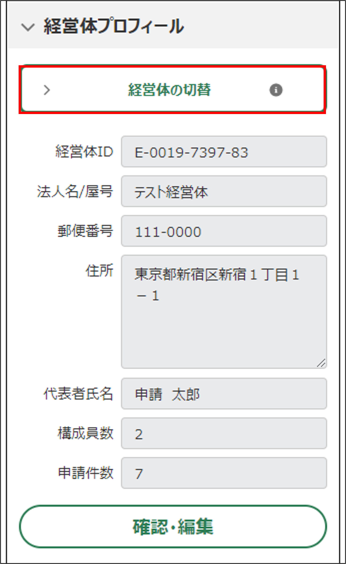 4.「経営体プロフィール」に、選択中の経営体情報が表示されます。