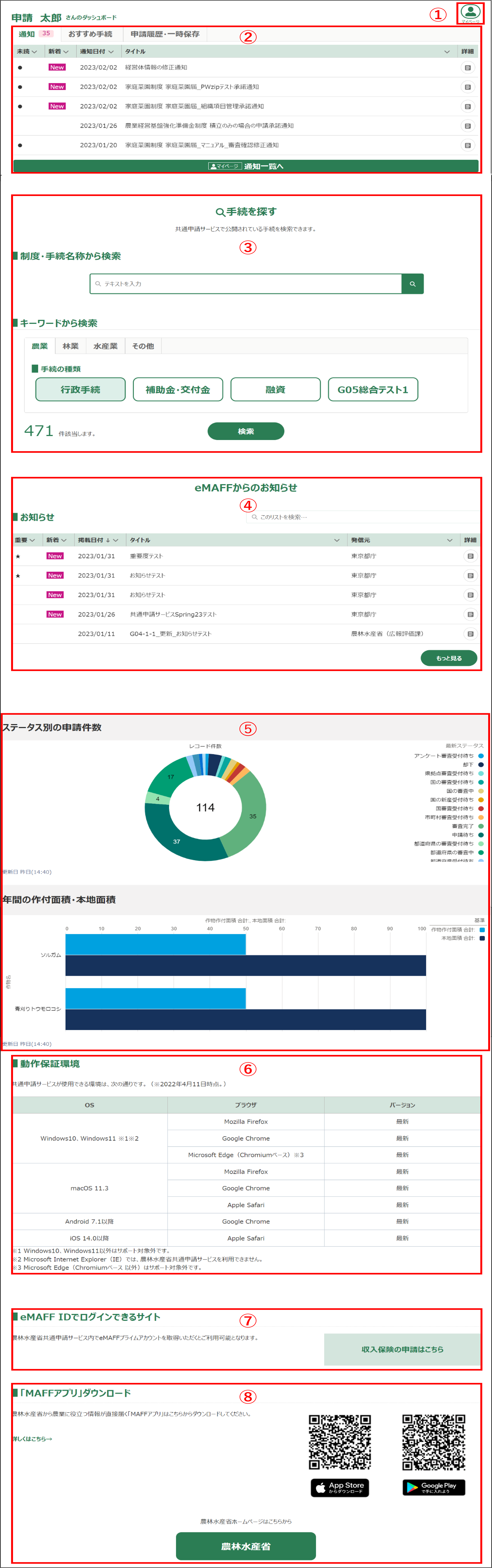 | ⑦ | eMAFF IDでログインできるサイト | 連携可能な外部システムへのリンクが表示されます。 操作詳細→eMAFF IDでログインできるサイト |