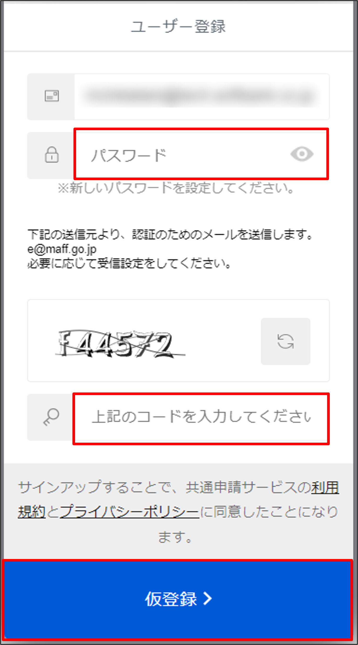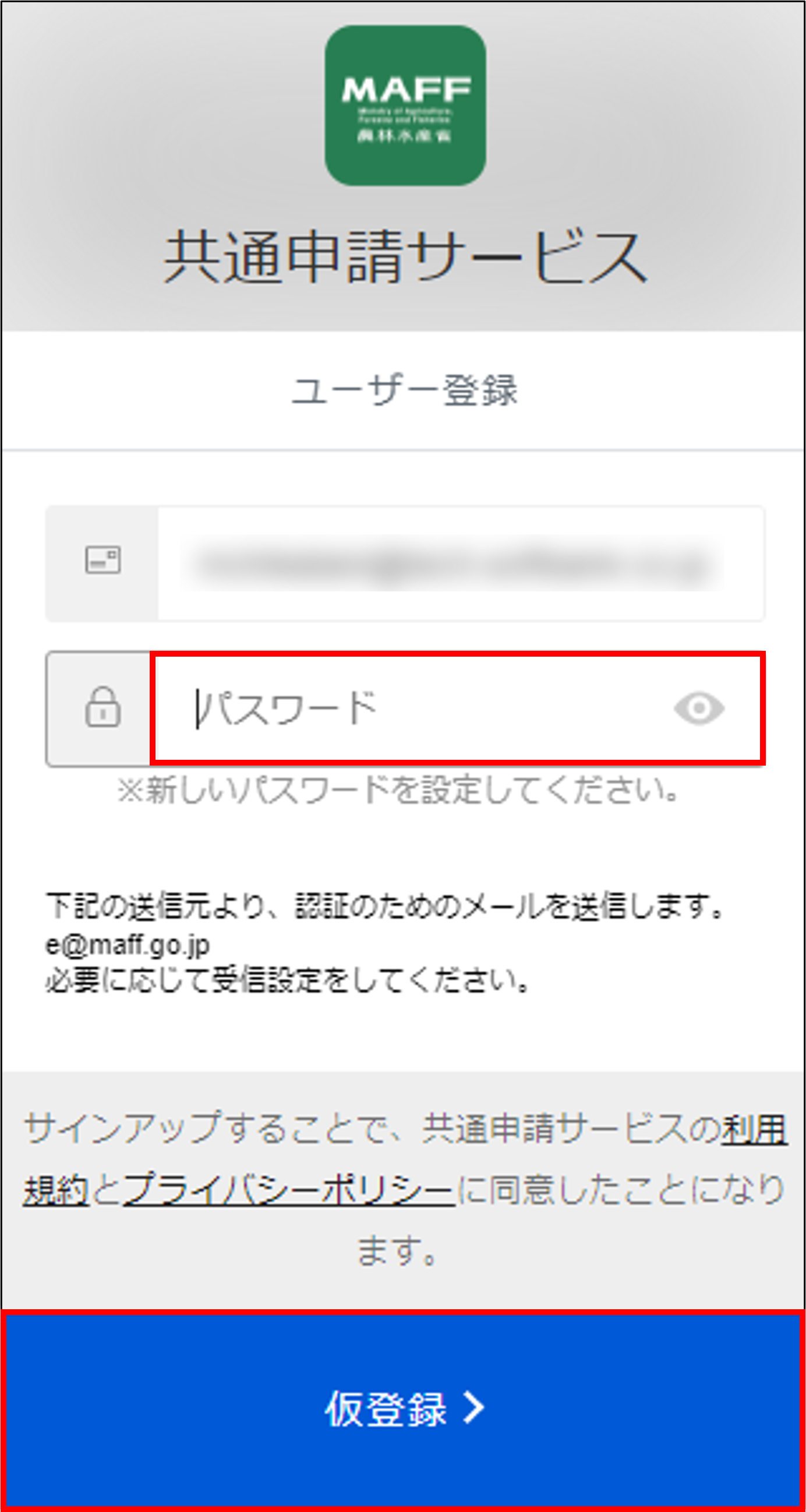 3.「ユーザー登録」画面が開きます。パスワードを設定し、「仮登録」をクリックします。