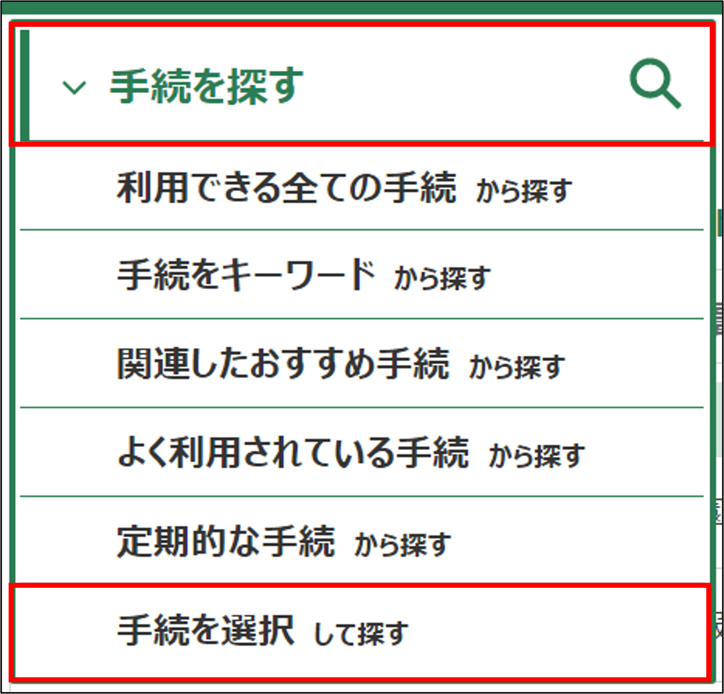 1. ホーム画面上部の「手続を探す」をクリックし、表示された一覧から「手続を選択して探す」をクリックします。