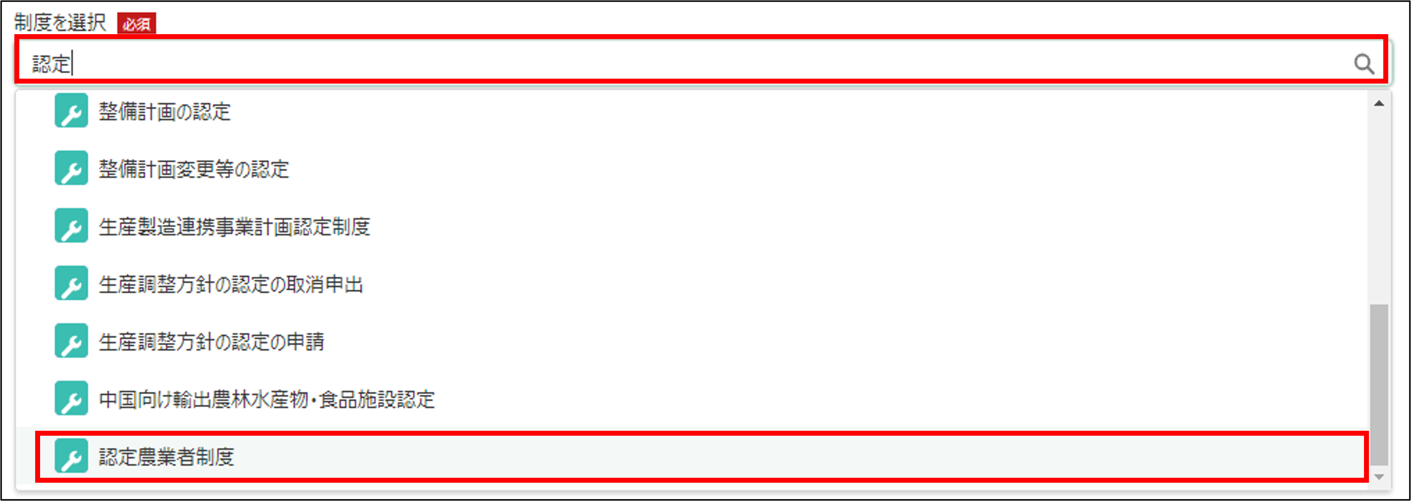 3.「制度を選択」欄をクリックし、表示された一覧から「認定農業者制度」をクリックします。