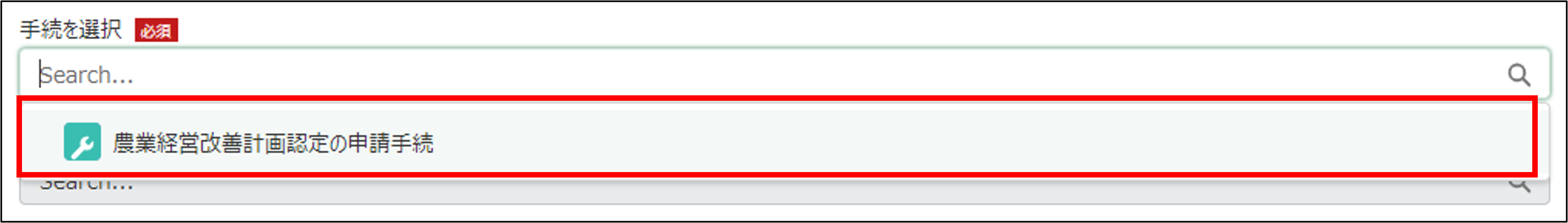 4.「手続を選択」欄をクリックし、表示された一覧から「農業経営改善計画認定の申請手続」をクリックします。