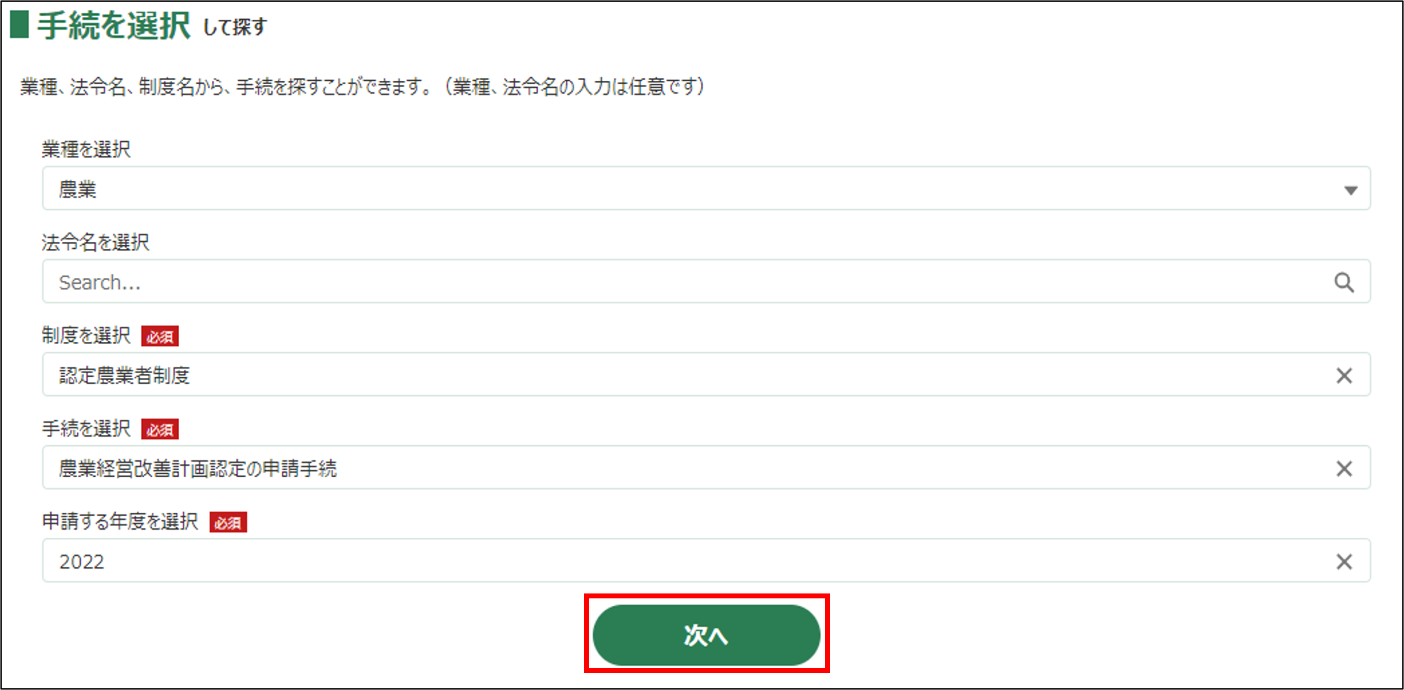 8.「認定農業者制度 農業経営改善計画認定の申請手続」画面が表示されます。