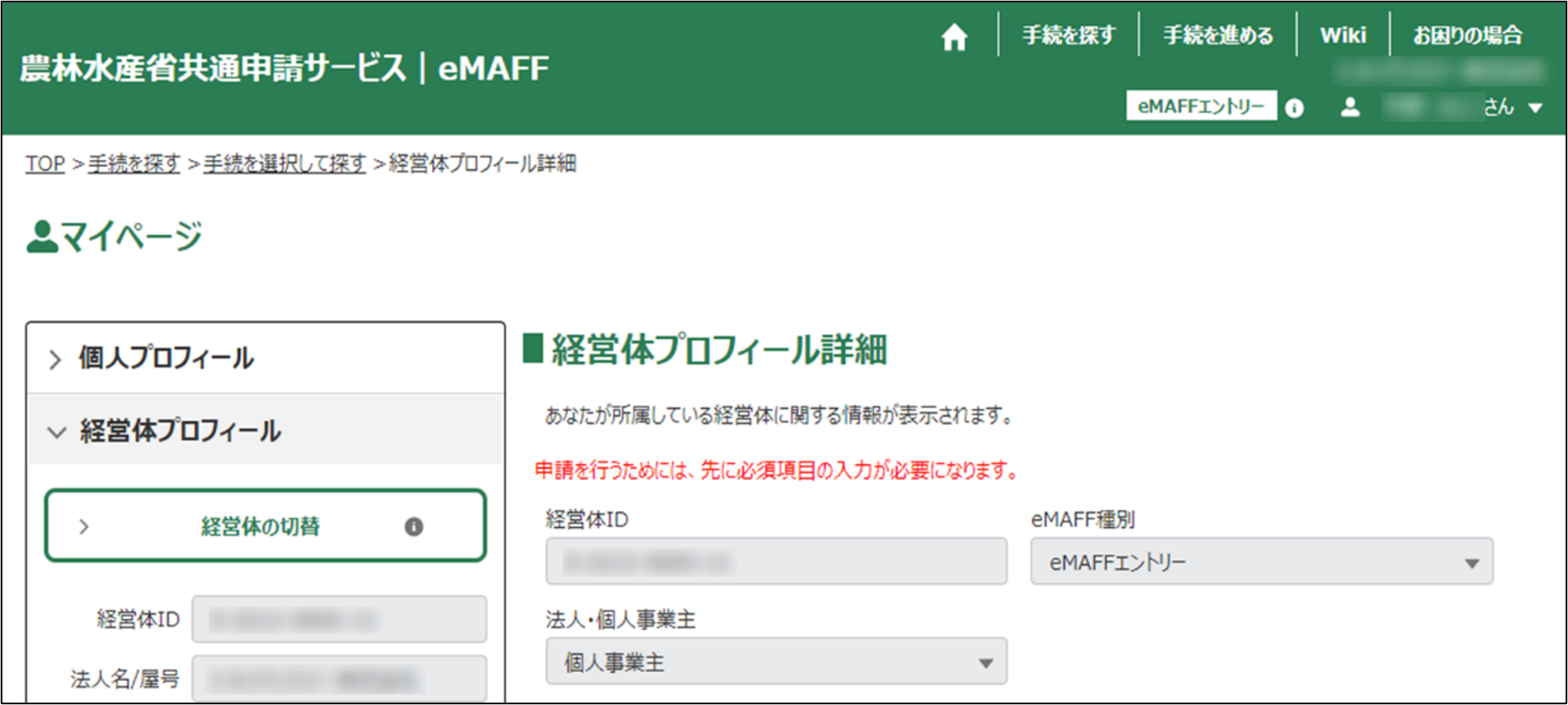 7.「手続の詳細」画面を開く前に、経営体情報詳細の必須項目に未入力の箇所がある場合には、「経営体プロフィール詳細」画面が開きます。