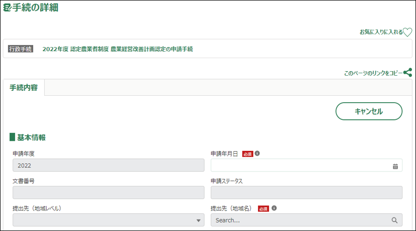 過去に、共通申請サービスで「農業経営改善計画」の申請をしたなど、共通申請サービス上に、申請者自身の「農業経営改善計画」の申請情報が保存されている場合は、「過去に申請した情報を利用して申請する」をご参照いただき、過去の申請情報をコピーして、変更箇所のみ修正して申請をしてください。