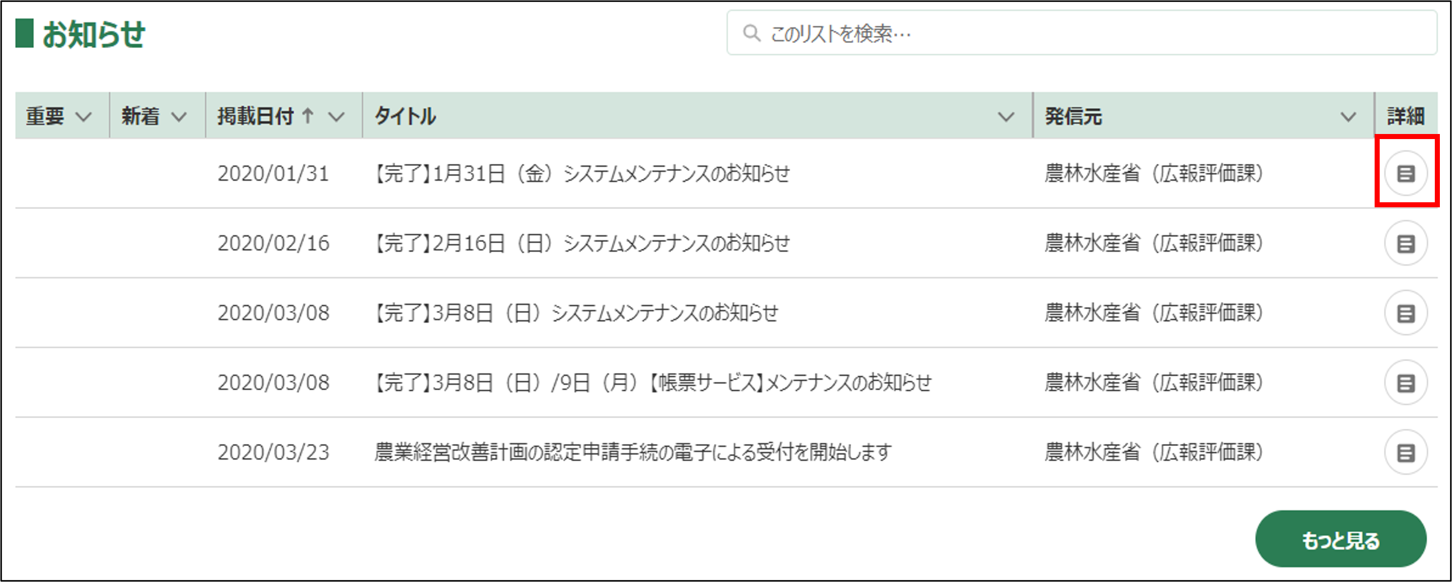 お知らせには、共通申請サービスの利用者に向けて、システムメンテナンス情報や電子申請受付開始のお知らせ等が表示されます。