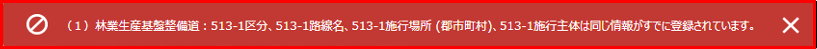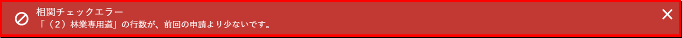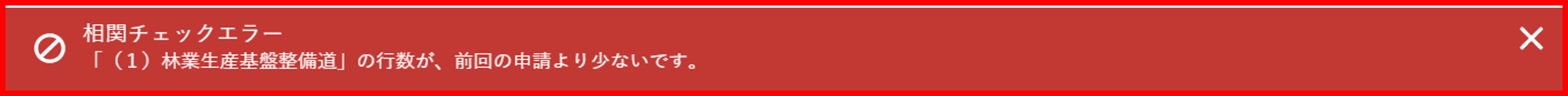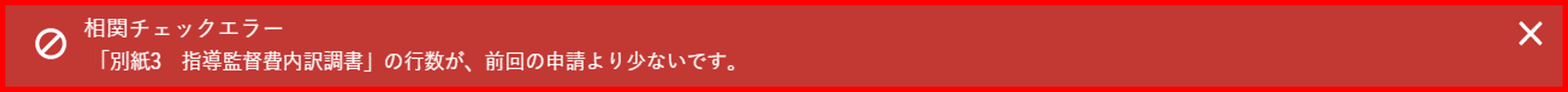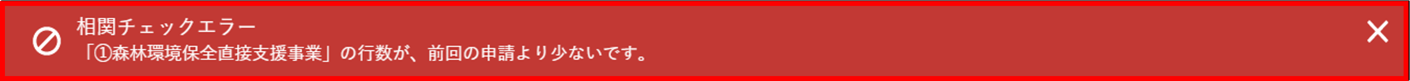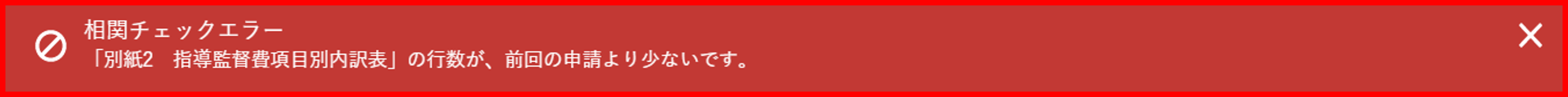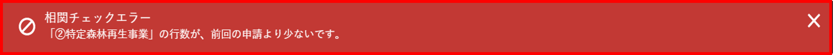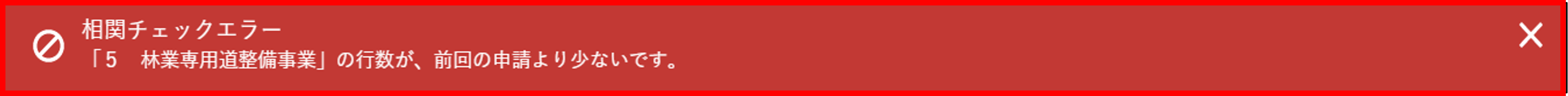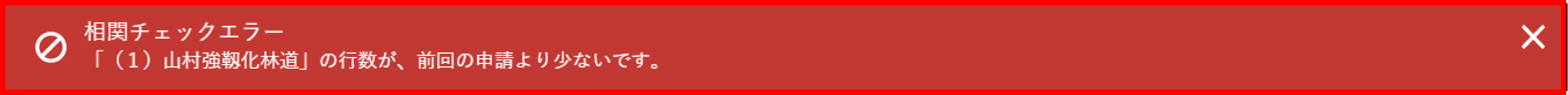 エラーが見つかった場合は、画面上部に、赤い背景のエラーメッセージが表示され、申請が中断されます。