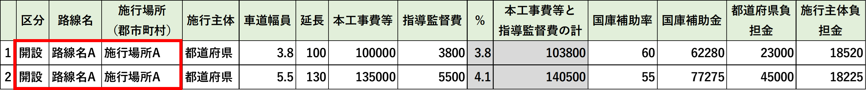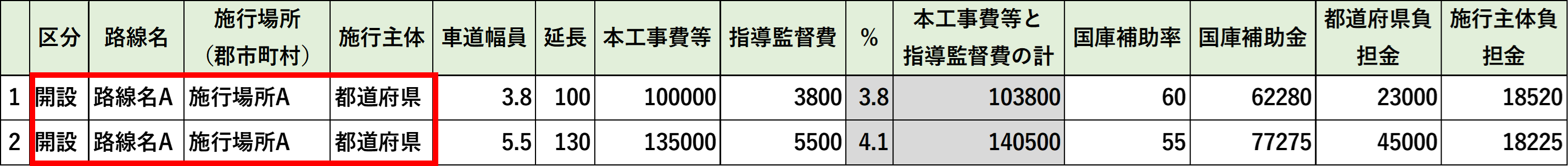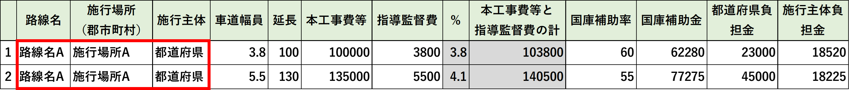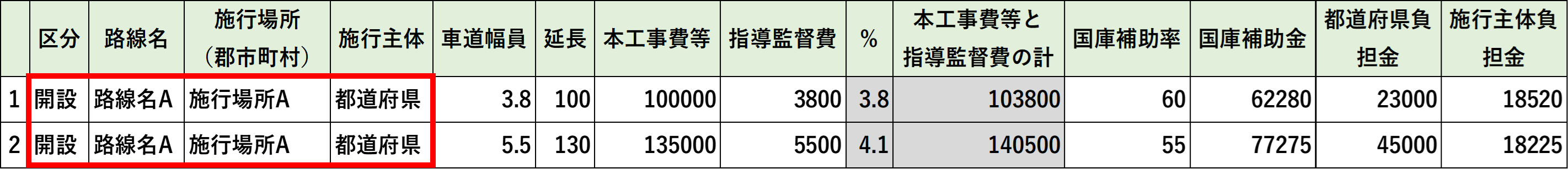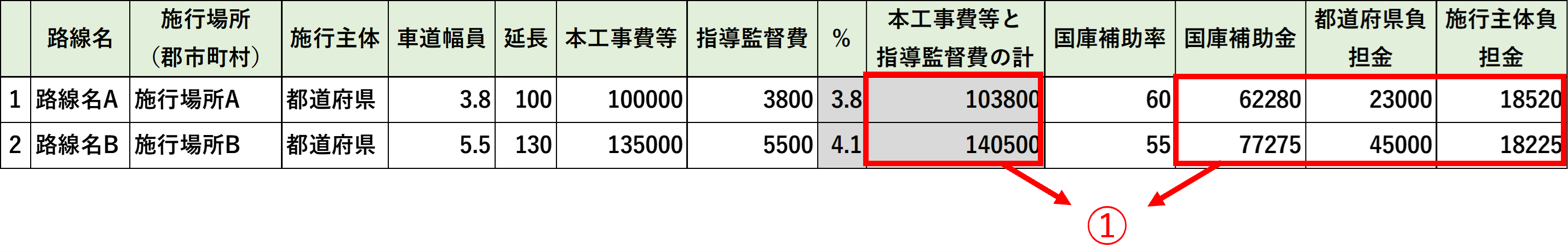 「国庫補助金」と「県(都道府)負担金」と「所有者(施行者)・施行主体負担金」の合計が表示されます。 |