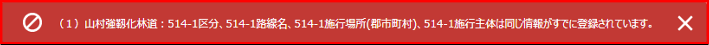 県(都道府)負担金を0以上の半角数字で入力してください。 ※区分が「うち県補助事業」の場合は、国庫補助金と県(都道府)負担金の合計を事業費で除算した値が0.4以上になる金額を入力してください。 ([国庫補助金]+[県(都道府)負担金])÷[事業費]>=0.4 |