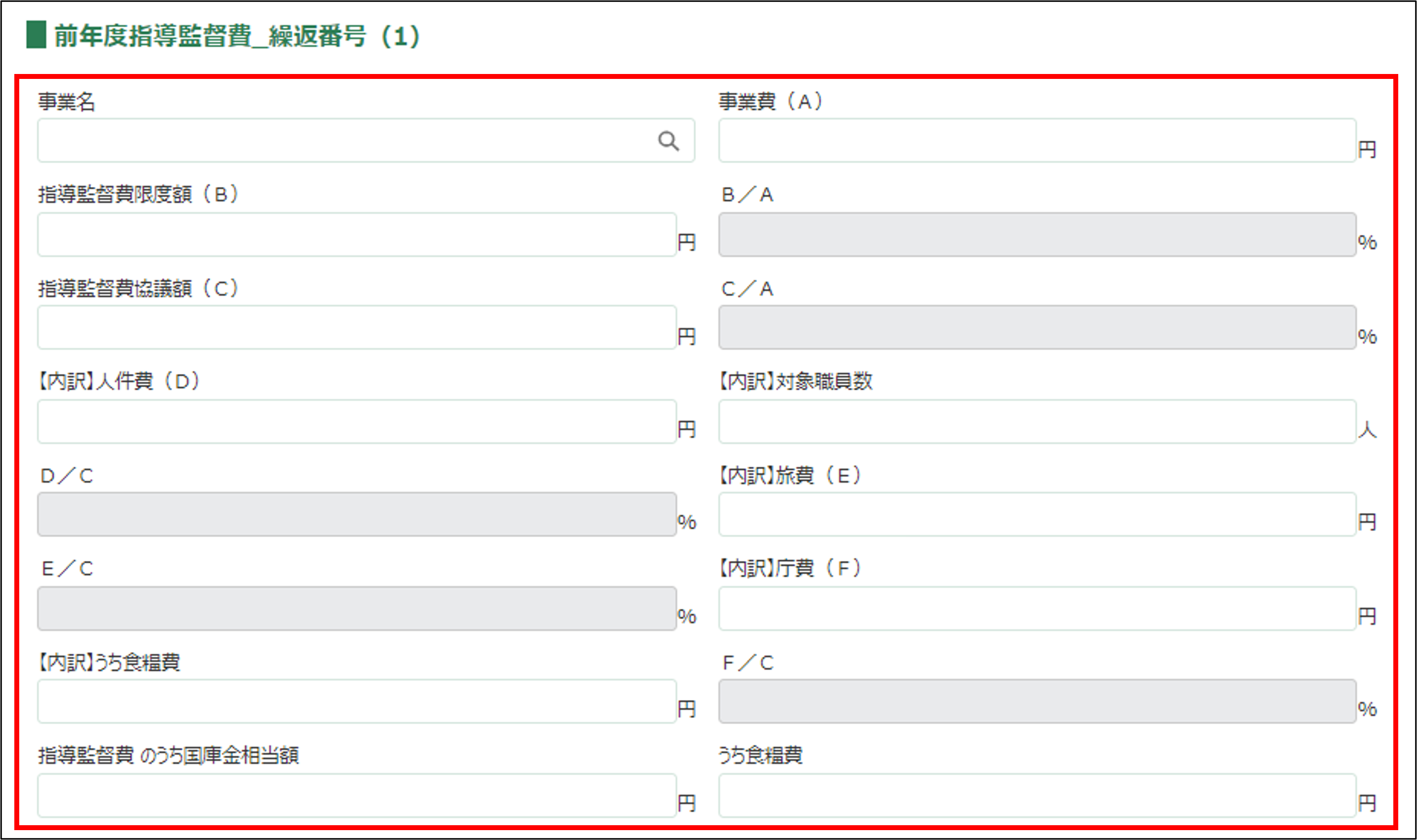 ・区分が「指導監督費」の事業費を区分が「うち県補助事業」の事業費で除算した値が0.045以下になるようにしてください。 [うち県補助事業の事業費]÷[指導監督費の事業費]<= 0.045 ・「前回の申請内容を反映する」ボタンで反映した明細行を削除したり区分を変更したりしないでください(区分以外は編集可能です。)。 |