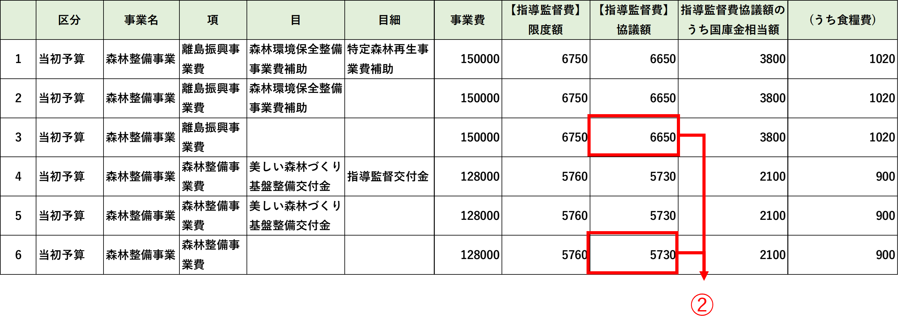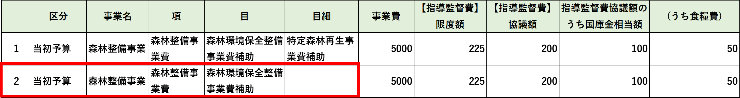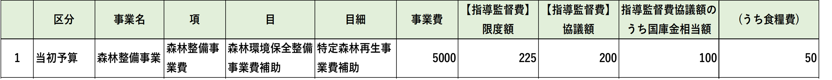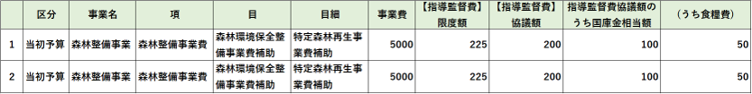 指導監督費限度額を0以上の半角数字で入力してください。 ※項が「地方創生基盤整備事業推進費」以外で目細が以下のいずれかに該当する場合は、指導監督費限度額を事業費で除算した値が0.045以下になる金額を半角数字で入力してください。 ・森林環境保全直接支援事業費補助 ・特定森林再生事業費補助 ・林道施設PCB廃棄物処理促進対策事業費補助 ・指導監督交付金 |