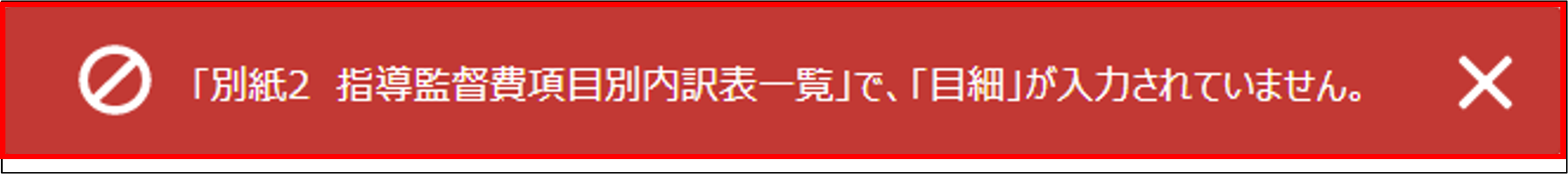 ・「事業名」「費目」「節」「区分」のすべてが同じ行の登録はできません。 ・「別紙2 指導監督費項目別内訳表」の「項」行の【指導監督費】協議額合計と、「別紙3 指導監督費内訳調書」の金額合計が一致する必要があります。 ・「前回の申請内容を反映する」ボタンで反映した明細行を削除したり、事業名、費目、科目・節、科目・区分を変更したりしないでください。(事業名、費目、科目・節、科目・区分以外は編集可能です。) |