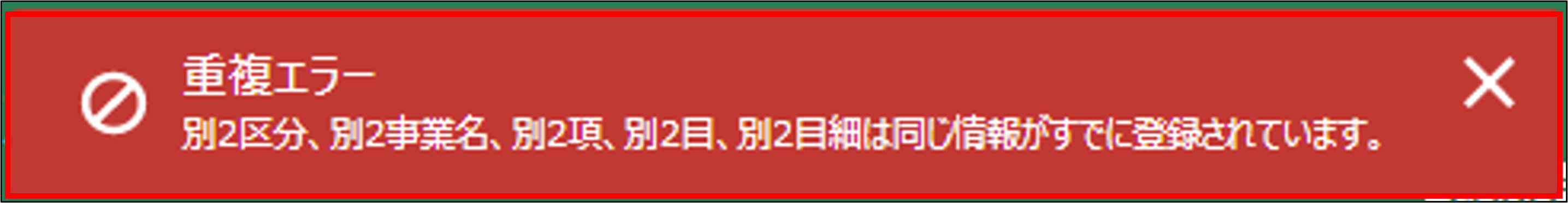 ・「区分」「事業名」「項」「目」「目細」のすべてが同じ行の登録はできません 。 ・「目」行の金額項目には「区分」「事業名」「項」「目」が同一の「目細」行の合計を入力してください。 ・「項」行の金額項目には「区分」「事業名」「項」が同一の「目」行の合計を入力してください。 ・「別紙2 指導監督費項目別内訳表」の「項」行の【指導監督費】協議額合計と、「別紙3 指導監督費内訳調書」の金額合計が一致する必要があります。 ・「前回の申請内容を反映する」ボタンで反映した明細行を削除したり、区分、事業名、項、目、目細を変更したりしないでください(区分、事業名、項、目、目細以外は編集可能です)。 |